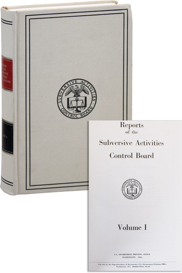 Washington DC: Government Printing Office, 1966. Octavo (23cm). Tan cloth boards; 820pp. Straight and tight, with text clean and unmarked; Near Fine. First volume of cumulative reports of the SACB; includes reports on the Board's investigations of the CPUSA, the Labor Youth League, the International Workers Order, the National Council of American-Soviet Friendship, the Joint Anti-Fascist Refugee Committee, the Civil Rights Congress and the Jefferson School of Social Science.