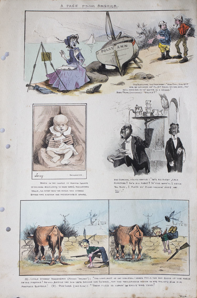 [With:] "A Sample of American Humour," a two-panel pen-and-ink drawing involving a Chinese and Native American, inscribed "from 'Judge'", possibly after "Zim" [and:] "A Page from America" and "Another Page from America," two sheets containing 9 pen-and-ink comic drawings, some hand-colored, signed "W.O.H." Many with highly problematic portrayals of race and gender.