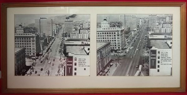 [Salt Lake City Lines?], 1946. Two large [19 cm x 23 cm] black and white photographs matted side by side in a wooden frame [27 cm x 56 cm]. The images have strong contrasts and the frame is in nice condition. Both views were taken from the Boston building on Main Street looking north. The image on the left is titled: 'June 21, 1946 Main Street Before Track Removal by Salt Lake City Lines.' The image on the right is titled: Oct. 3, 1946 Main Street After Track Removal, Paving and Construction of Loading Zones by Salt Lake City Lines." The titles are shown over the Judge Building.
