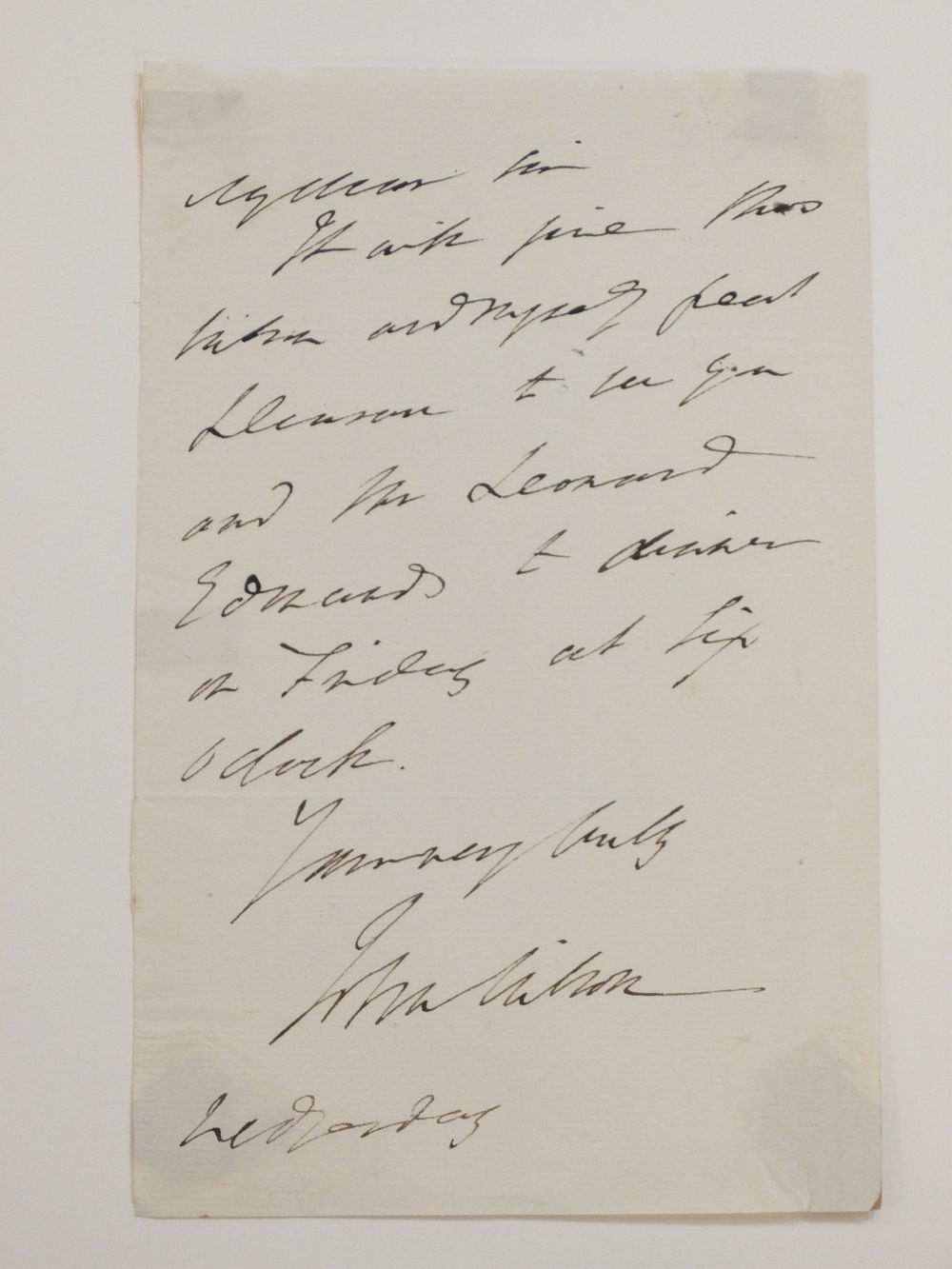 unbound. very good. A.L.S. 8vo. 1 page, no place, no date, paper with partial watermark c. 1810-1830, an invitation, "It would be a pleasure for you and Mr. Leonard Edwards to join us for dinner on Friday at six o clock." Mounting remnants on verso, otherwise in very good condition.