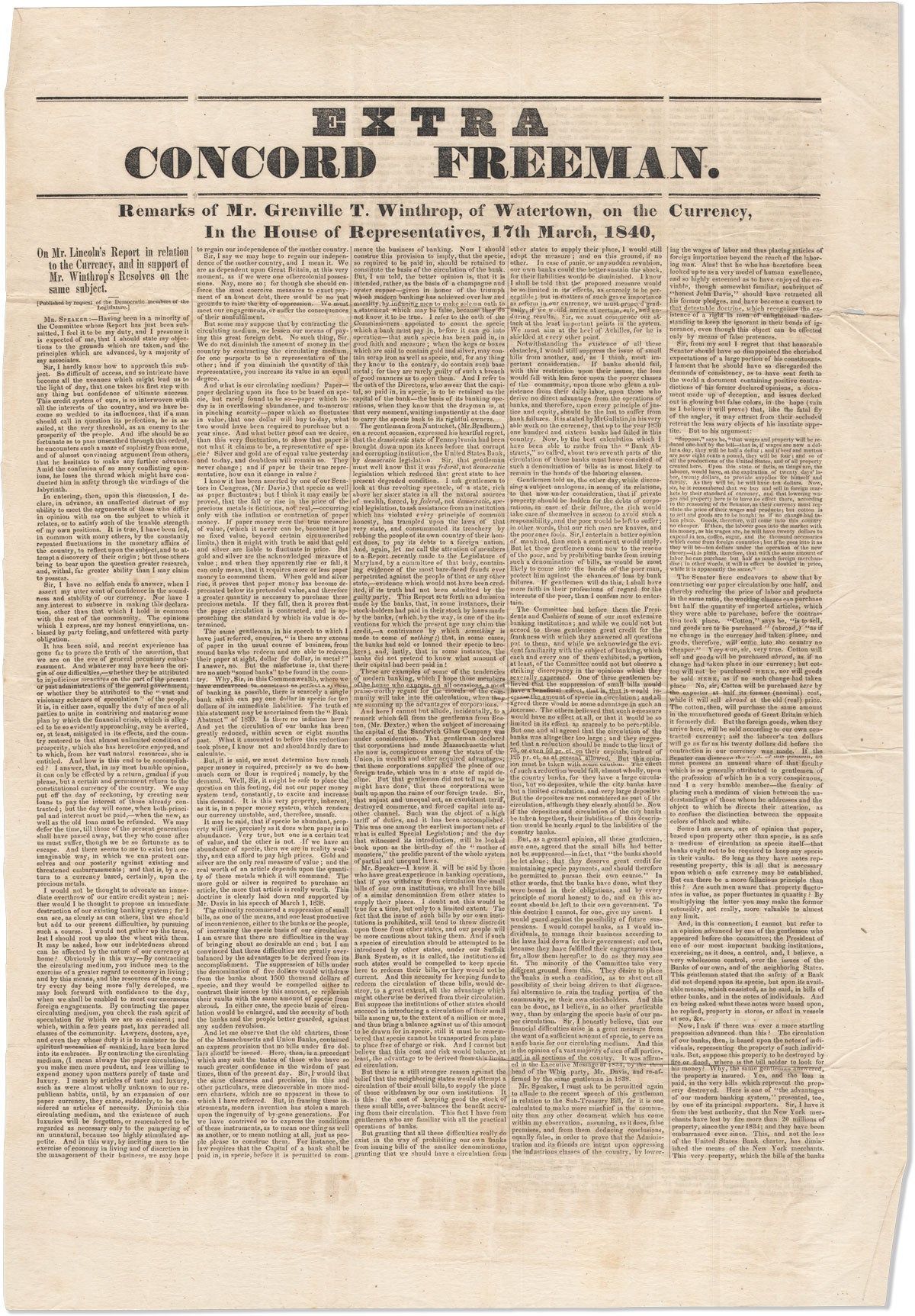 [Concord, Mass: 1840]: Concord Freeman. Folio broadsheet (50cm x 35cm), 5 columns on recto beneath headline and caption title; 3 columns on verso. Vertical and horizontal folds; small closed tear at right margin; Very Good. A Massachusetts Democrat attacks Whig monetary policies including the issuance of "soft" currency and the establishment of a National Bank. Winthrop appears to have entered politics following a checkered military career which included an 1832 court-marshal for abandoning his post during a particularly long-winded election-day sermon. William & Mary Quarterly (v.XV, 1907) reprints in full an 1841 letter from G.T. Winthrop to Governor Gilmore of Virginia, in which Winthrop writes: "In 1839 I was again elected to [the Mass. legislature] but was permitted to remain a member but a single year, in consequence of some remarks which I made upon ye question of ye currency." The letter goes on to emphasize their jointly held economic views: opposition to a national bank; opposition to the Distribution Bill; and the necessity of a high protective tariff to raise revenue.
