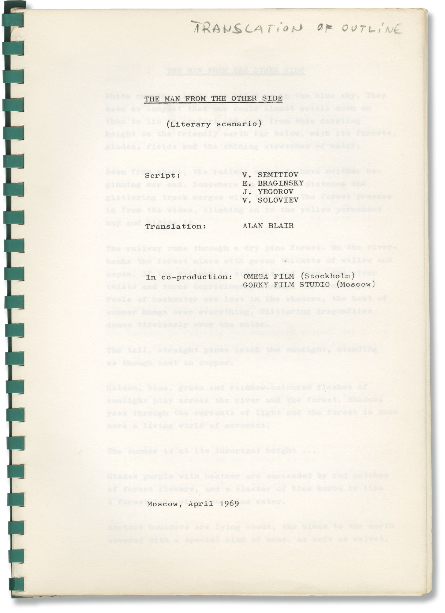 White titled self wrapper, lacking rear wrapper, noted as Literary Scenario on the front wrapper, dated April 1969, with credits for screenwriters Semitiov, Braginsky, Yegorov, and Soloviev, and translator Alan Blair. 92 leaves, with last leaf of text numbered 91. Mechanical duplication. Pages Near Fine, wrapper Near Fine bound with a comb binding.