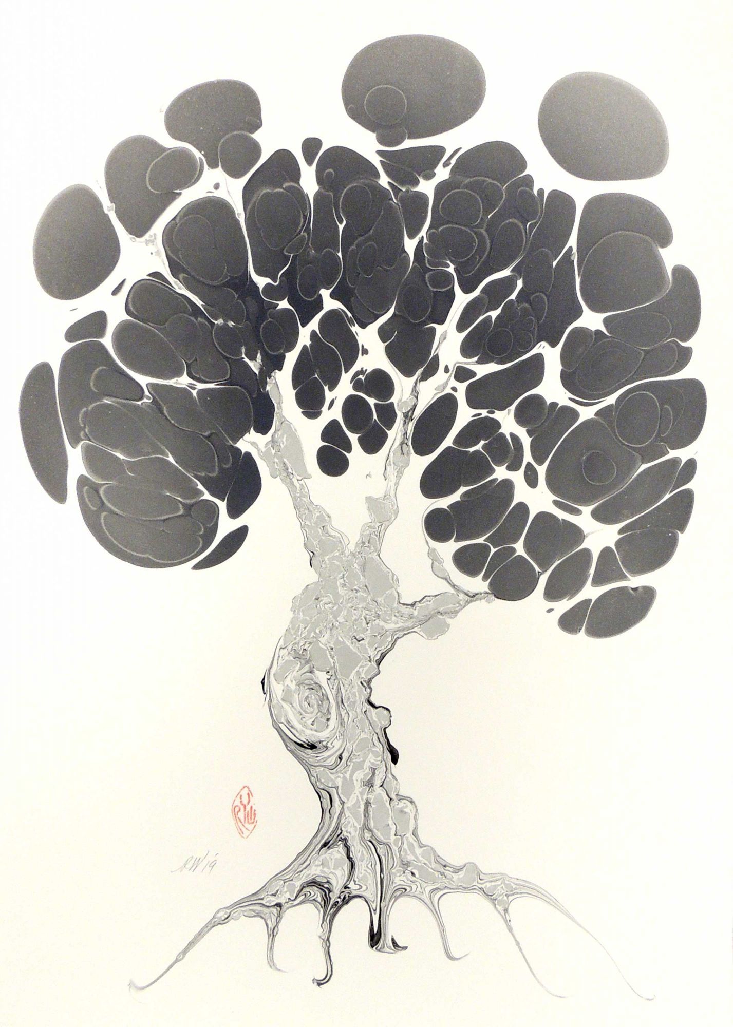 Toronto: Studio Robert Wu, n.d.. Fine. An exquisite hand marbled sheet by master marbler Robert Wu depicting a grey tree. As the sheets are done individually, each varies slightly and is unique. Wu has been experimenting with paper marbling for many years and has developed a unique take on this traditional art form which he calls “marbled graphics.”
