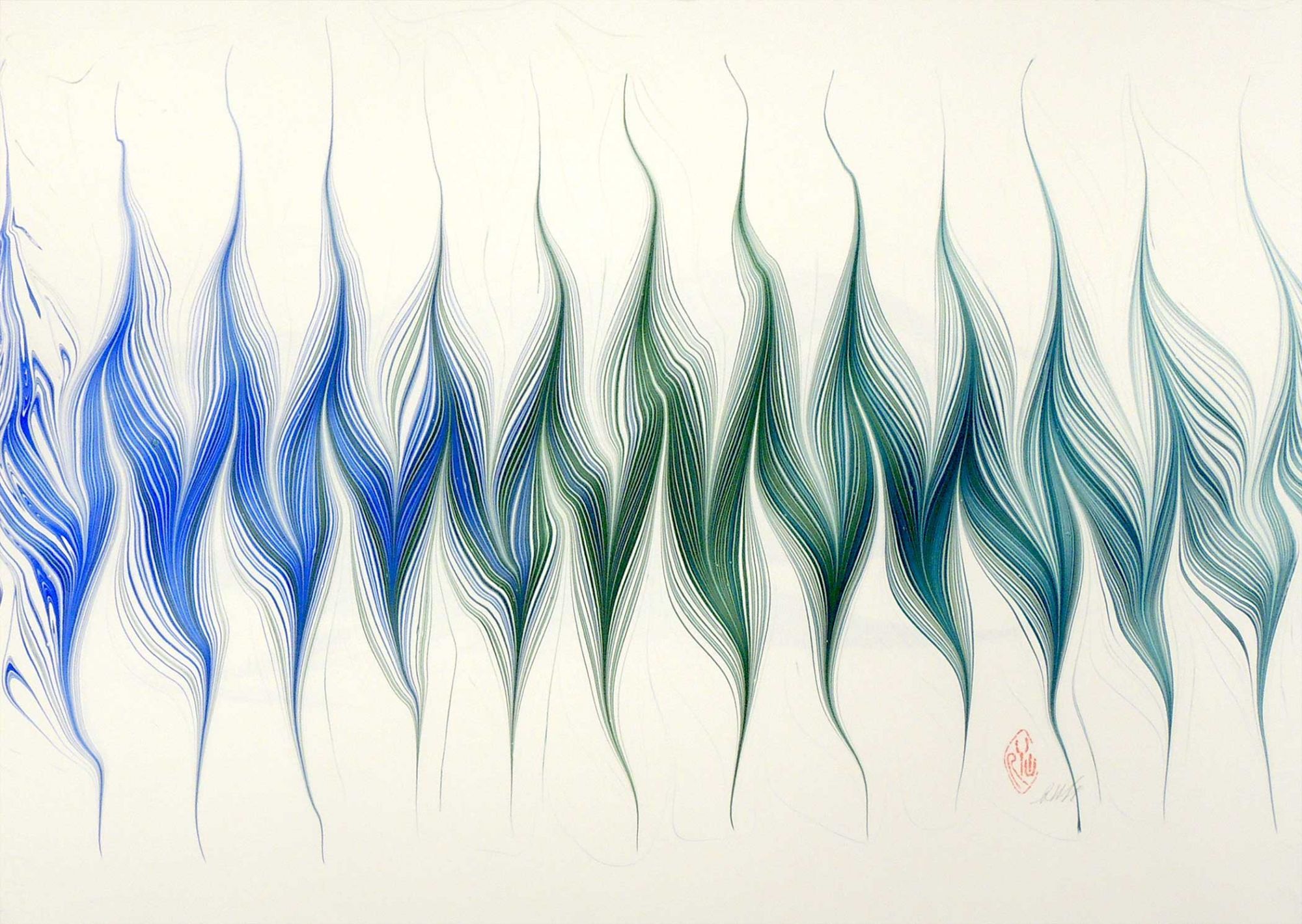 Toronto: Studio Robert Wu, n.d.. Fine. An exquisite hand marbled sheet by master marbler Robert Wu depicting a design called "Rhythm." As the sheets are done individually, each varies slightly and is unique. Wu has been experimenting with paper marbling for many years and has developed a unique take on this traditional art form which he calls “marbled graphics.”