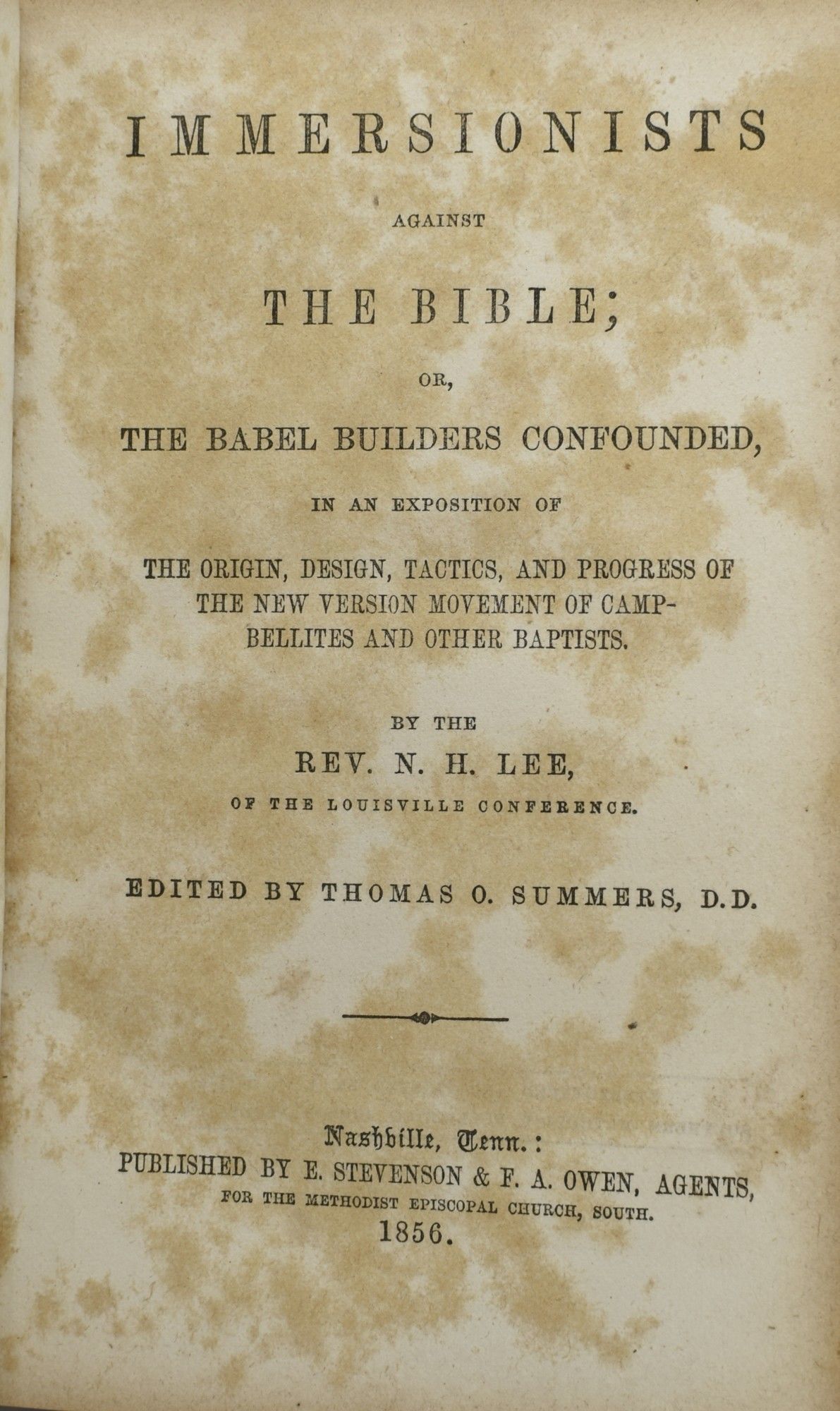 Nashville, Tenn: E. Stevenson & F. A. Owen, 1856. First Edition. Hard Cover. Very Good binding. First Edition of Rev. N. H. Lee's Immersionists Against the Bible, edited by Thomas O. Summers. The Immersionists were a type of Baptist that believed that immersion was necessary for a proper baptism. Some foxing. Scattered annotations in pencil. Sunning to the spine. Purple embossed cloth, with gilt lettering and designs on the spine. Very Good. Very Good binding.