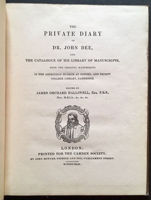 London: Printed for the Camden Society, 1842. Decorative Cloth. Very Good +. The very uncommon 1842 1st edition of this original publication of "two curious documents concerning Dr. John Dee", the great 16th century occut philosopher (1527-1609) who devoted much of his life to the study of alchemy, divination and Hermetic philosophy. 1) "His Private Diary, written in a very small illegible hand on the margins of old Almamacs, discovered a few years ago by Mr. W.H. Black, in the library of the Ashmolean Museum at Oxford". 2) "A Catalogue of his Library of Manuscripts, made by himself before his house was plundered by the populace, and now preserved in the library of Trinity College, Cambridge". This 1842 volume, a slim octavo in its original chocolate-brown boards, has held up very nicely. Solid and VG+, with decorative blindstamping to the panels and still-bright gilt-titling and flourishes along the spine. Just a touch of light bubbling to the rear panel, small, neat former owner name and 1940 date at the front free endpaper. Apart from this, clean as could be, with no other writing or markings of any kind internally and a strong, very sturdy binding. By any measure, an impressive copy of this rare mid 19th century examination (through his diary and his personal library of manuscripts) of the mind of Dr. John Dee.
