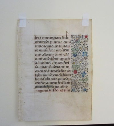 France (ca. 1450). Fine. A manuscript leaf from a Book of Hours, in Latin, on vellum; 115mm x 83mm; verso and recto. Gothic littera bastarda script, in red and dark brown, or black ink; single column, 14 lines. One-quarter panel border decoration of rinceaux, with burnished gold ivy leaves and floral motif in tempera. A fine example from the 15th Century.