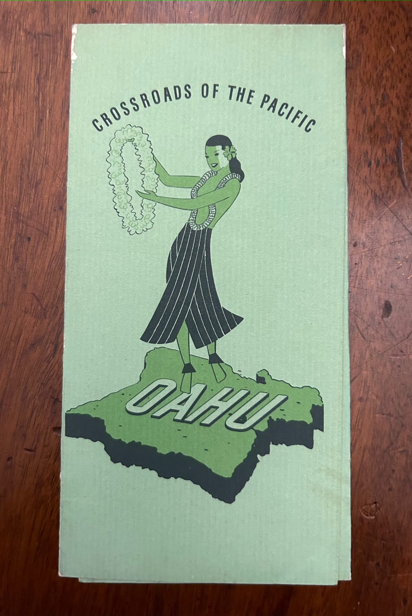 Honolulu, Hawaii: Hawaii Tourist Bureau, 1959. Very Good+. Featuring an image of the Island of Oahu and traditional Hulu dancer on the cover, inside depicts a map of the island with mountainous regions, major roadways and text providing information useful to tourists. The pocket size brochure states above the map "Territory of Hawaii" so the map is dated before statehood, but after Pearl Harbor. Also indicates environmental and historical markers. Double-sided paper brochure with pictorial covers printed in dark green/light ink on green paper. Some edge wear from folding, otherwise in remarkable condition. Folded: 15x8cm, unfolded: 30x23cm.