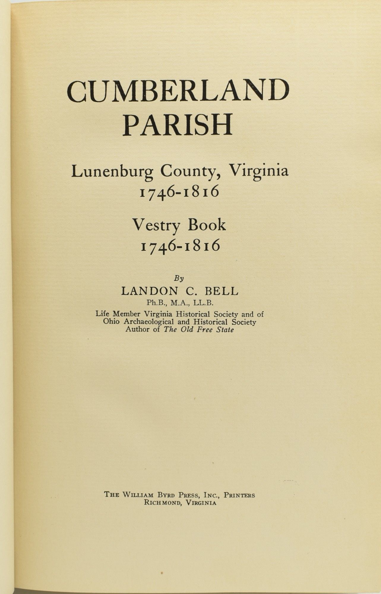 Richmond, Virginia: The William Byrd Press, 1930. Hard Cover. Very Good binding/Good dust jacket. Signed. Landon C. Bell's Cumberland Parish, Lunenburg County, Virginia 1746-1816; Vestry Book 1746-1816. Signed by the author on the front endpaper, with a personal inscription to his nephew. Publisher's advertising and errata leaves laid in, leaving scotch tape stains to a few pages. Folding map of the county. Small chips and soiling to the dustjacket. Blue cloth. Very Good with Good dustjacket. Housed in a blue cloth dustjacket. Very Good binding / Good dust jacket.