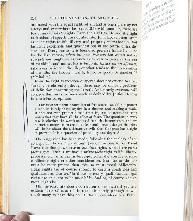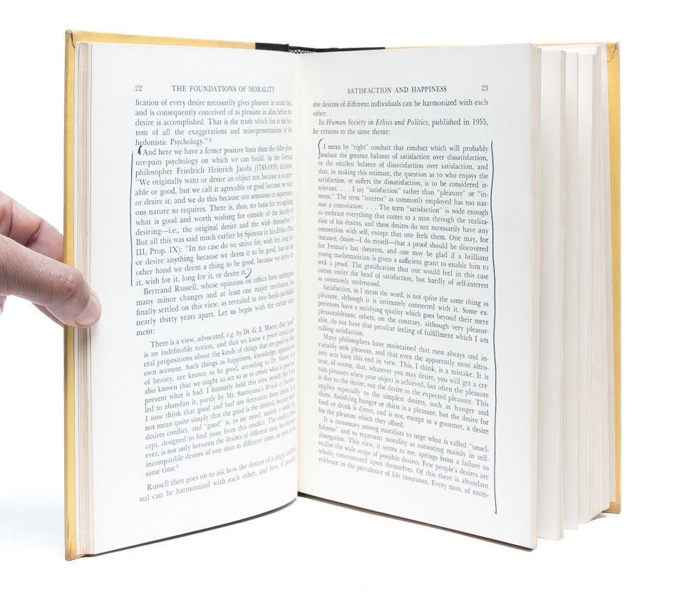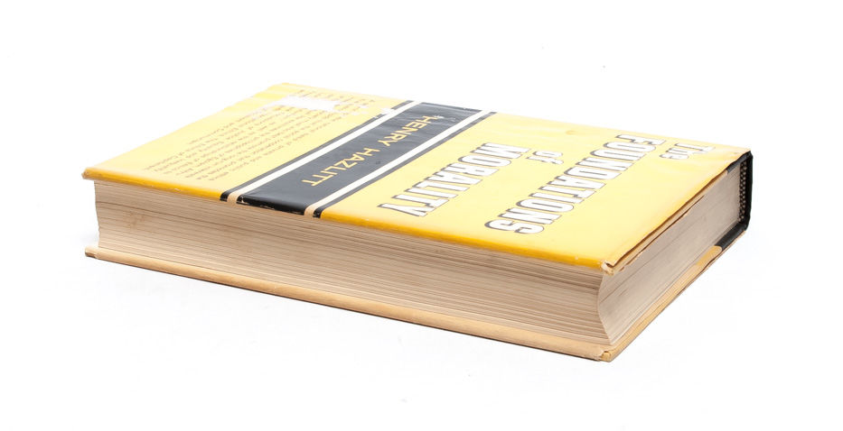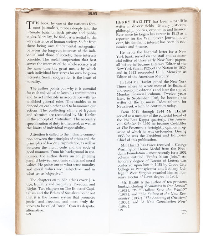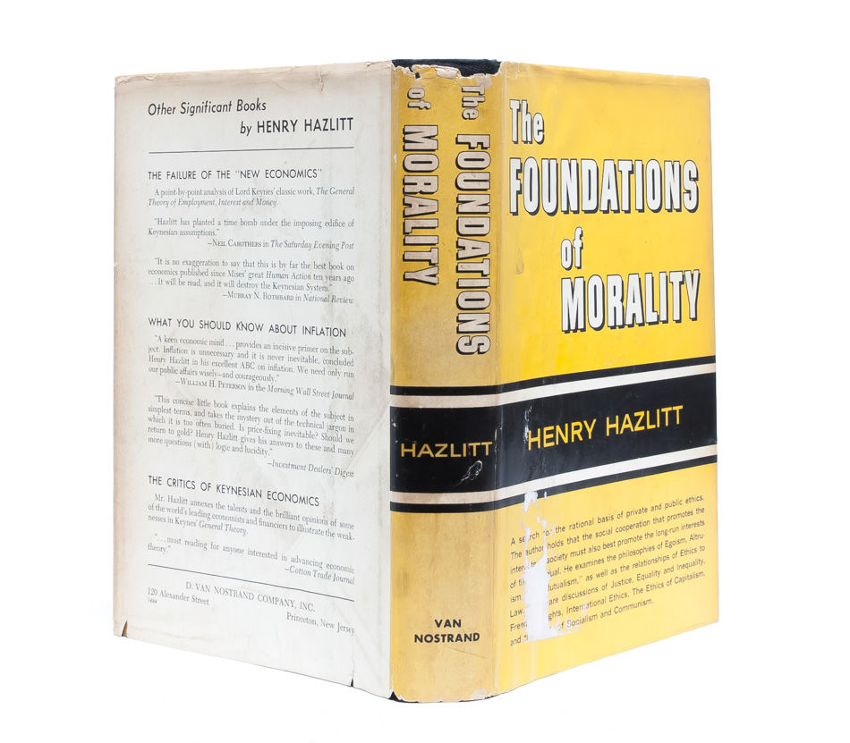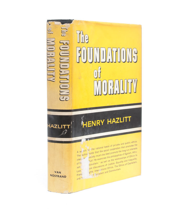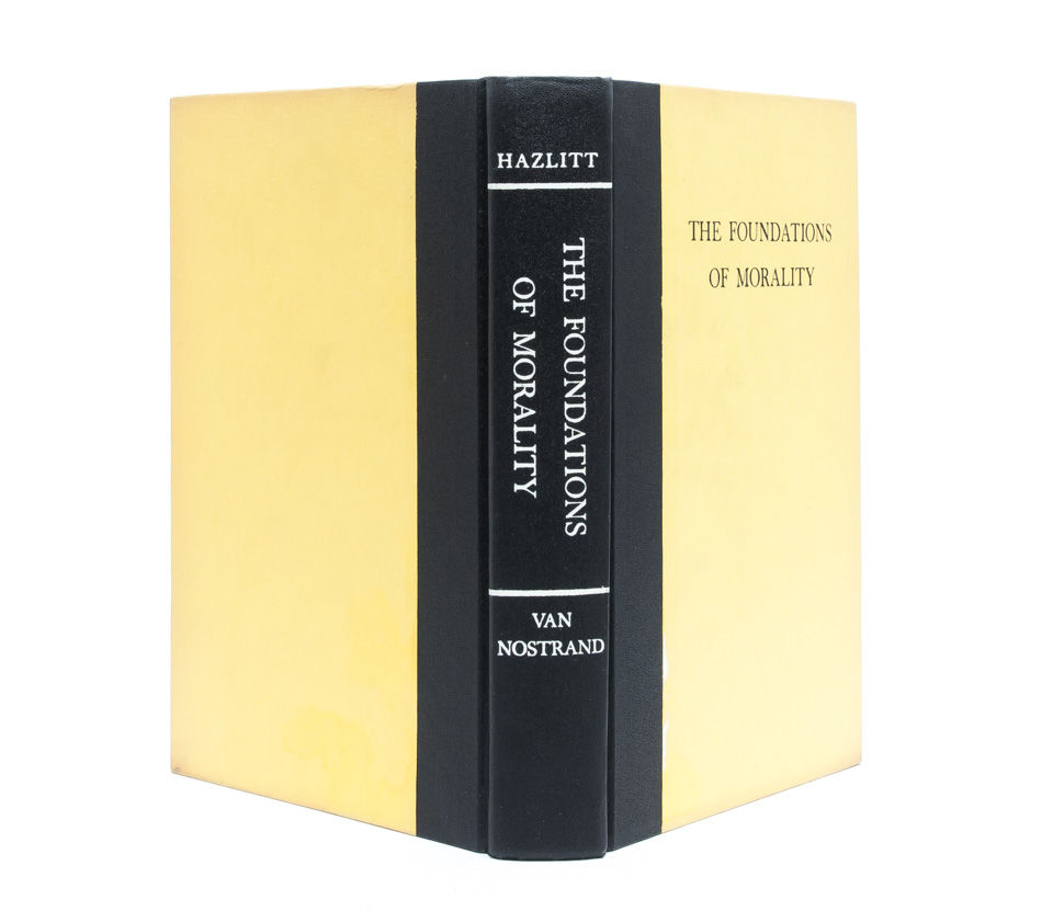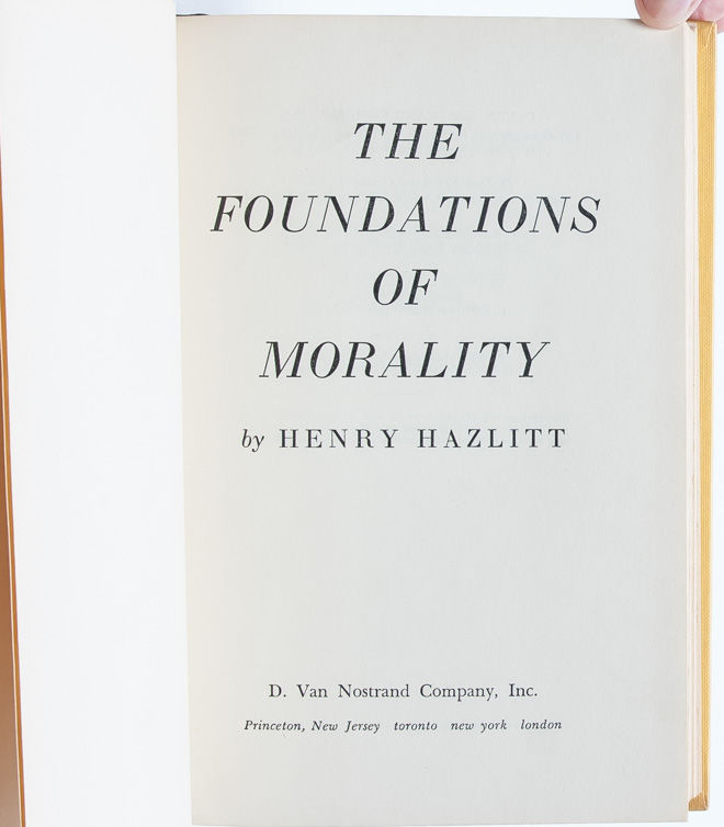 Hazlitt's Foundations of Morality "probes deeply into the ultimate basis of both private and public ethics. Morality, he finds, is essential to the very existence of human society. So far from there being any fundamental antagonism between the long-run interests of the individual and those of society, these interests coincide. The social cooperation that best serves the interests of the whole society is at the same time the great means by which each individual serves his own long-run interests." In their ethical, political, and economic views, Hazlitt and Rand largely align. "Ayn Rand and Henry Hazlitt made the same point in different ways" (Tamny). Indeed, the two authors, who were also friends in their personal lives, influenced each other's views even prior to Rand's composing The Fountainhead (Burns). In the present copy, Rand uses blue ink to score important sections in chapters including Intuition & Common Sense, Vocation & Circumstance, and Free Will & Determinism. By the time of Hazlitt's book release, Rand had become a major cultural force; and the present copy shows evidence of her immersion and continued study into Objectivism's role in cultural ethics.