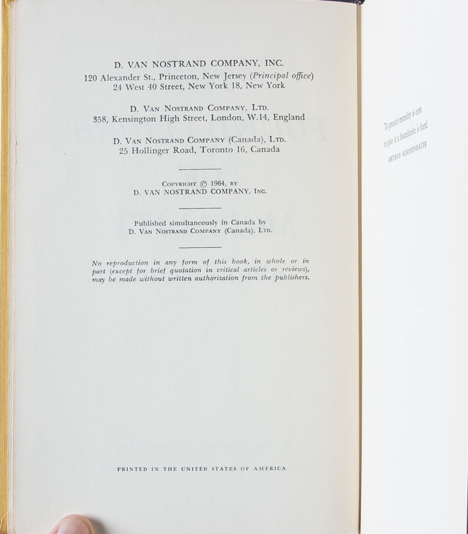 Princeton: Van Nostrand, 1964. First edition. Near Fine/Very Good. Publisher's cloth binding with black spine and yellow boards. Some rubbing to front and rear boards with edges slightly toned, else a bright and fresh copy overall. In its unclipped black and yellow jacket. Spine sunned and panels rubbed and toned; remnant of removed adhesive tag to front cover; chips and small closed tear to bottom of rear panel; paper loss to crown of spine. Provenance: the private library of Ayn Rand. The present copy contains Rand's marginalia and underlining.
