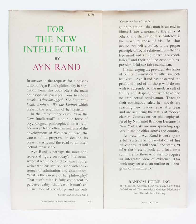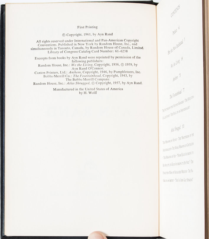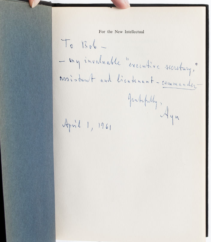 New York: Random House, 1961. First edition. Near Fine/Near Fine. Original black publisher's cloth binding. Small bump to top front corner. Dark blue endpapers with mild offsetting. Near Fine in a like jacket, which is unclipped and shows only slight creasing and wear to corners. Inscribed and signed by Rand on the half title in the year of publication: "To Bob -- my invaluable 'executive secretary,' assistant and lieutenant commander-- Gratefully, Ayn. April 1, 1961." Robert Hessen, to whom this copy was inscribed, was Rand's trusted personal assistant.