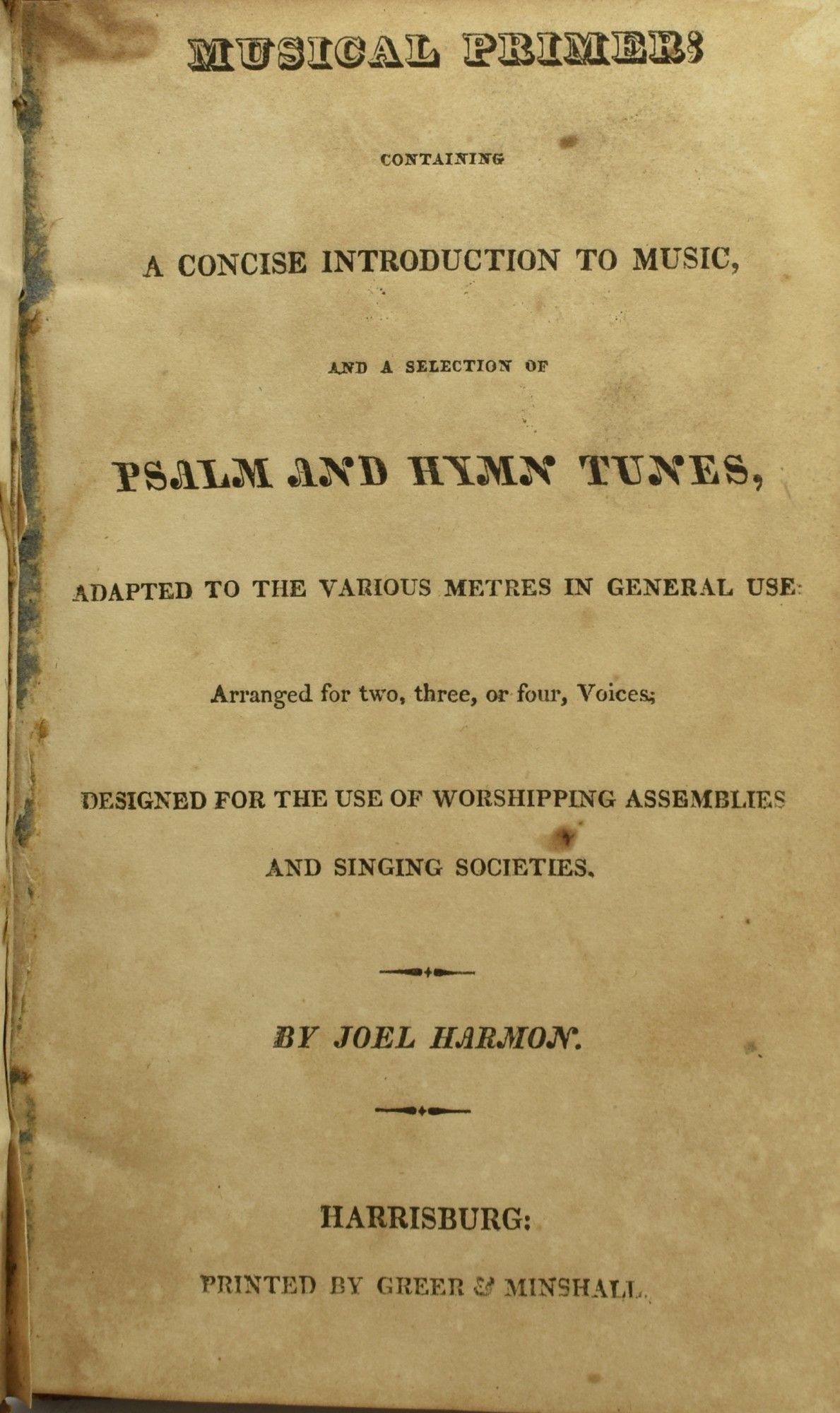 Harrisburg: Printed by Greer & Minshall, 1825. First Edition. Quarter Leather. Very Good binding. First Edition of Joel Harmon's Musical Primer. With musical theory at the start of the text, followed by many religious songs, their musical scores, and lyrics. Contemporary owner's name on the front pastedown, dated December 27, 1825. Lacking the front endpaper. Else complete; 72 pp., with index and errata at the rear. OCLC notes that Joel Harmon "formed a class for 'the study of music and improvement in the art of singing' which met weekly in Harrisburg sometime during the 1820s." Uncommon, with only one institutional holding listed on OCLC. Slight loss at the head of the spine, and some soiling to the paper boards. Quarter leather over drab paper boards. Very Good. (Catalogue of the American Library of the Late Mr. George Brinley, pt. III, 5918.). Very Good binding.