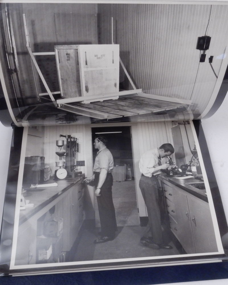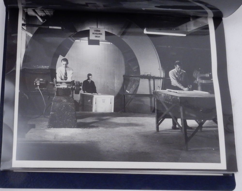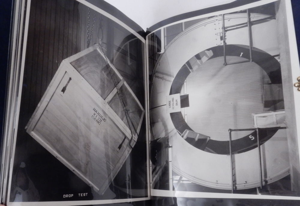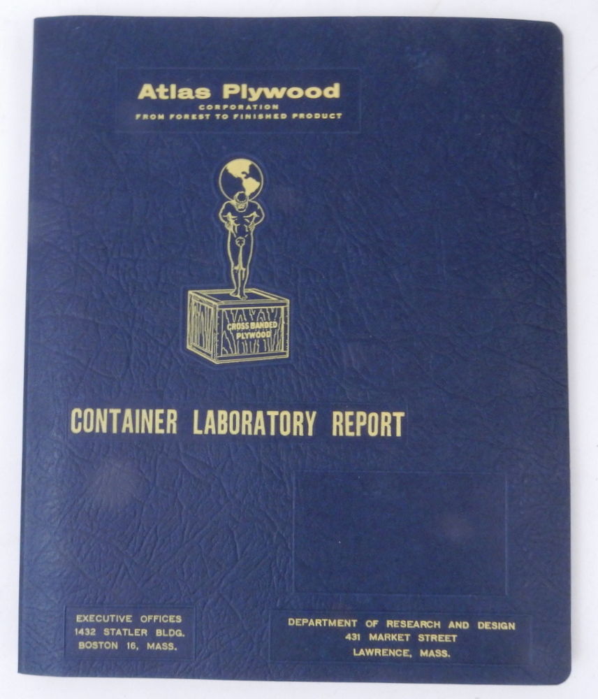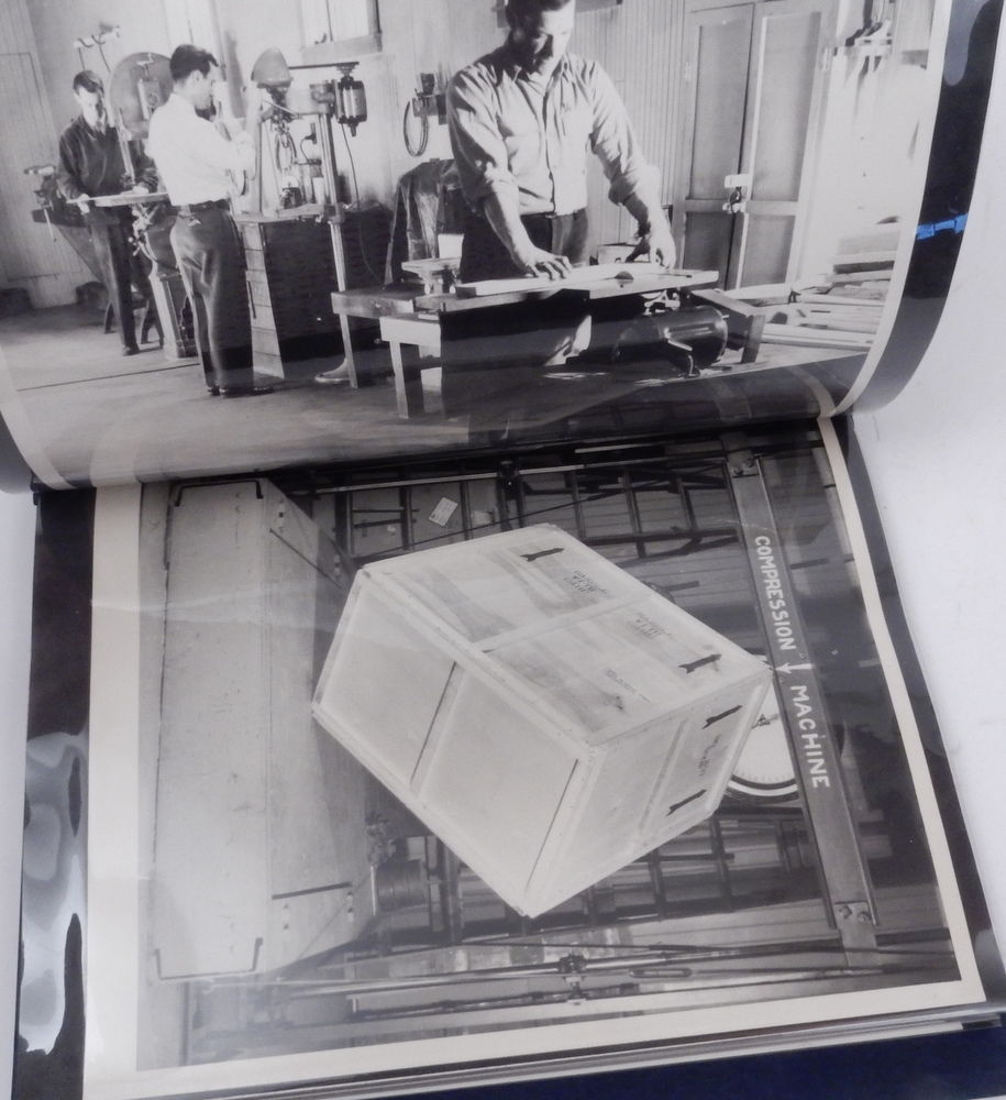 Boston 16, Mass: Atlas Plywood Corporation, 1956. Boards. Near Fine. 9 1/2 x 11 3/8 inches (dimensions of tabbed loose leaf binder). Fourteen 8 x 10 inch (approximate) photographs plus "title page" photograph. Boards. A loose leaf binder with photographs depicting testing of crates and the attendant necessary equipment. Photos show a "large revolving drum", construction shop, a compression machine, what looks like a drop test chassis with crate affixed, two photos of several men in a laboratory using a microscope and several other instruments, a blueprint in progress, two closeup images of instruments including a mullen tester, a very large press used to compress pieces of plywood together, testing in action, and several other images. No doubt used as a sales tool demonstrating how thoroughly the company could build and test crates for reliable performance.