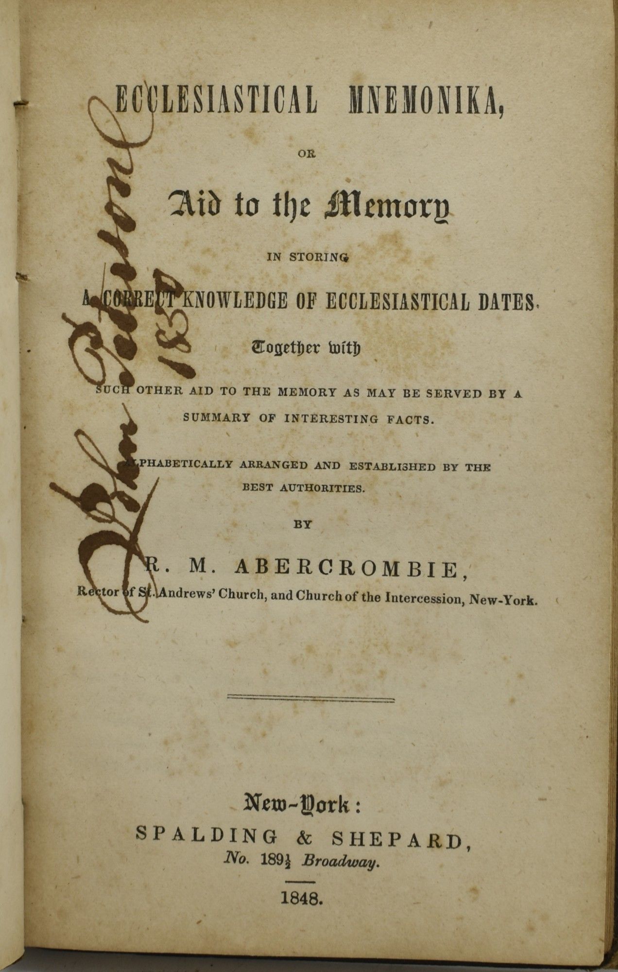New York: Spalding & Shepard, 1848. Quarter Leather. Good binding. R. M. Abercrombie's Ecclesiastical Mnemonika. Contemporary owner's name on the title page, and namestamp on the front pastedown. Minor foxing. Rebacked in later leather. Spots of surface loss to the front board. Quarter green leather over embossed brown cloth boards. Good. Five unique institutional holdings noted on OCLC. Good binding.