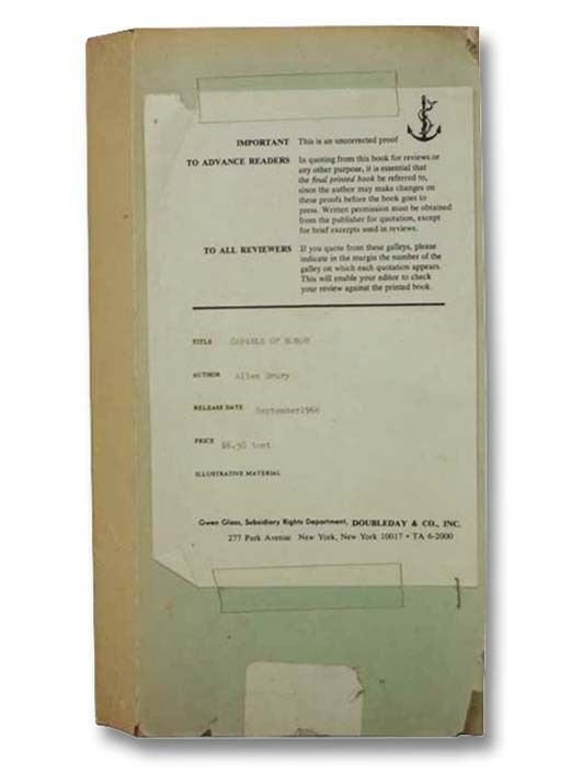 Doubleday & Company, Inc, 1966. Advance Uncorrected Proof. Soft Cover. Good. Advance uncorrected proof. Spine creased and lightly toned, book information taped to front wrapper, sticker on front and rear wrappers, top and bottom corners of front wrapper chipped. 1966 Soft Cover. Unpaginated. "Capable of Honor is a political novel written by Allen Drury, published in 1966. It is the second sequel to Drury's novel, Advise and Consent. The novel takes place in the same fictional universe as Advise and Consent. Capable of Honor examines the role that journalists play during a US presidential campaign. In the novel, Harley Hudson, the affable but inept Vice President from the first novel, is now president and seeking a term of his own. Governor Ted Jason of California challenges Hudson for the Majority Party's nomination (the novels never use the proper names "Republican" or "Democrat" but the descriptions of Majority Party corresponds strongly to the Democrats of the 1960s). Racial antagonism volatile media personalities, and ambitious politicians come together for the climax at the Majority Party's nomination convention." -- Wikipedia