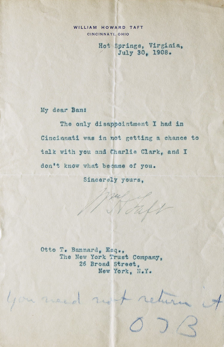 Hot Springs, Virginia, 1908. 1 p. On Cincinnati, Ohio personal stationery. Docketed in blue pencil "you need not return it OTB". 8vo. Bifolium. Old folds, very good. 1 p. On Cincinnati, Ohio personal stationery. Docketed in blue pencil "you need not return it OTB". 8vo. "My dear Ban: The only disappointment I had in Cincinnati was in not getting a chance to talk with you and Charlie Clark, and I don't know what became of you...." The letter is dated the month after he received the Republican nomination for the upcoming presidential election, and a little more than a week after Taft resigned as Secretary of War to devote himself full time to campaigning. Otto Bannard was "one of the very few acquaintances who called the President 'Bill,' and who had known him since his college years in New Haven" (Lurie p 139).