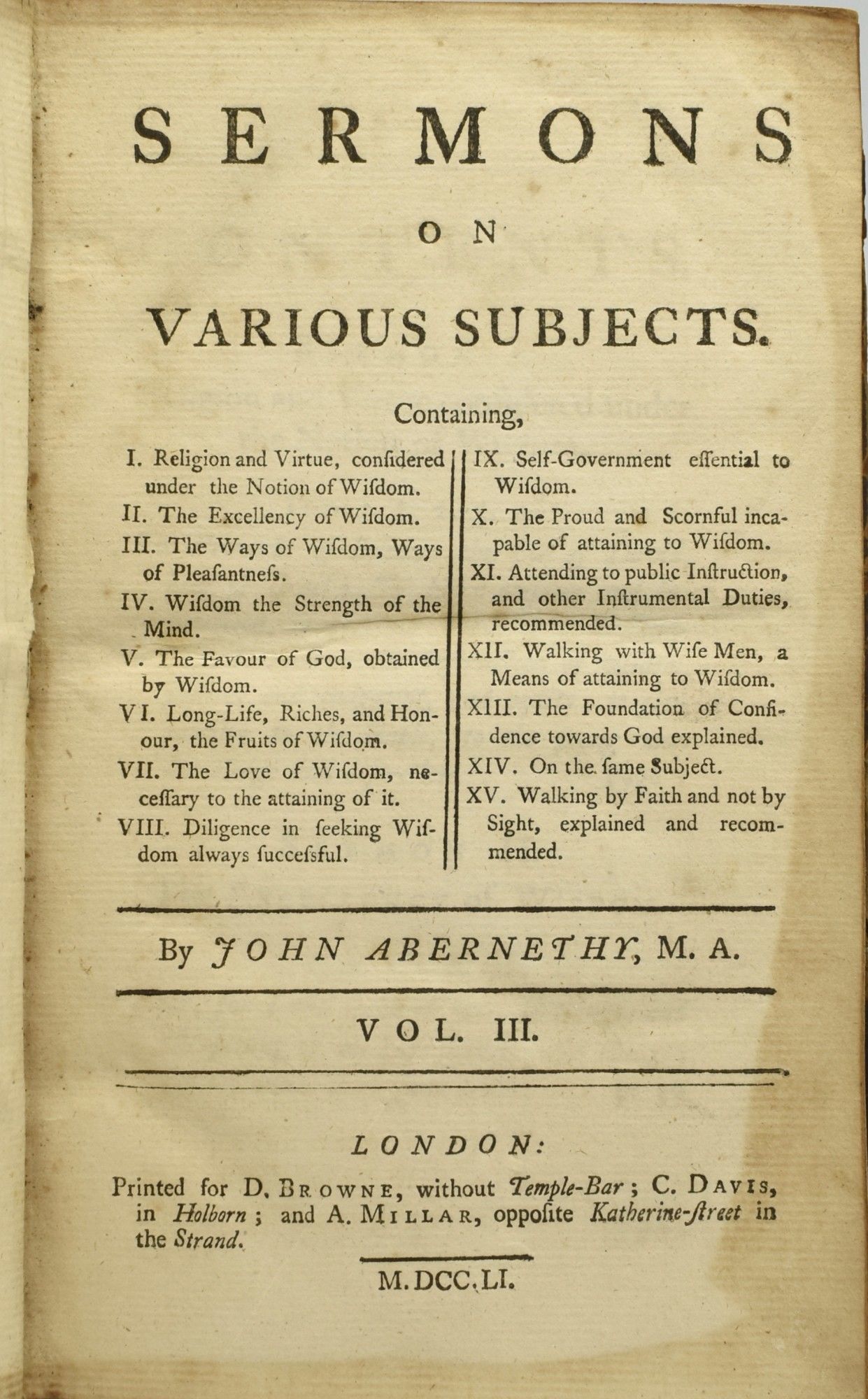 SERMONS ON VARIOUS SUBJECTS. VOL. III. (ONE VOLUME ONLY)