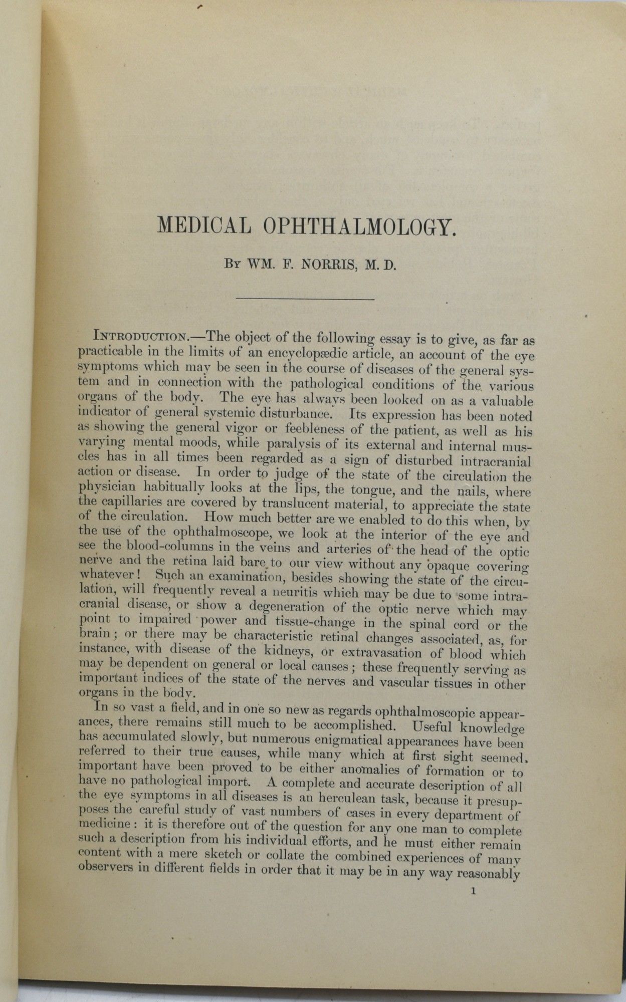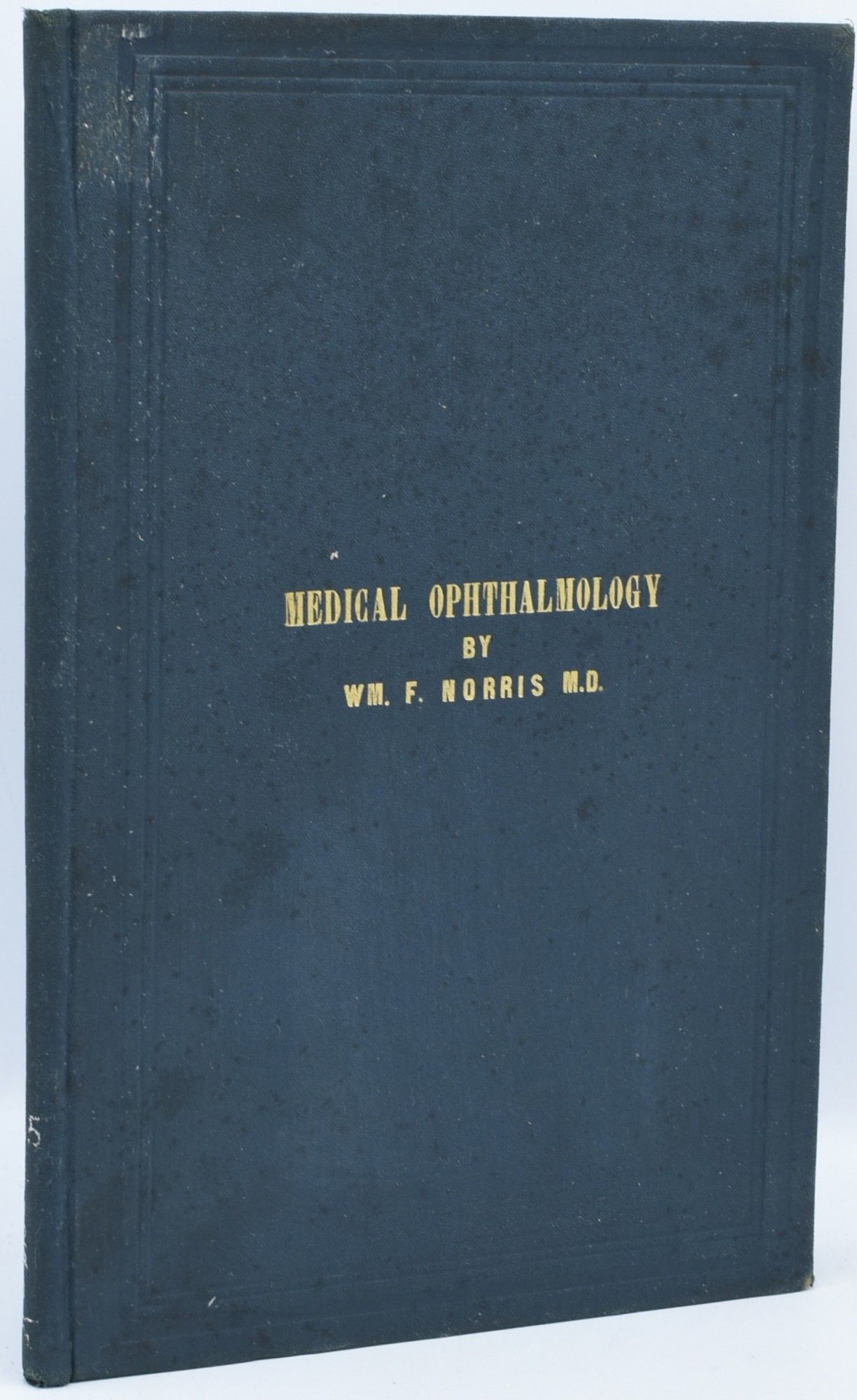 1886. Hard Cover. Good binding. An uncommon essay on Medical Ophthalmology by Wm. F. Norris. Dr. William Fisher Norris (1838-1901) was an esteemed pioneer in the field of ophthalmology. He served as a surgeon in the Civil War, later founding the University of Pennsylvania's Department of Ophthalmology, and authoring one of the first nationally recognized textbooks on the subject. The text is unmarked. A library plate on the front pastedown notes "from the library of the late Mrs. Wm. F. Norris." Deaccessioned from an institutional library, with library card and slip pasted onto the rear endpaper. White library marks at the tail of the spine. Green cloth with gilt lettering. No institutional holdings noted on OCLC. (Perelman School of Medicine University of Penssylvania "Endowed Professorships" https://www.med.upenn.edu/endowedprofessorships/william-f.-norris-and-george-e.-de-schweinitz-professorship-of-ophthalmology.html ). Good binding.