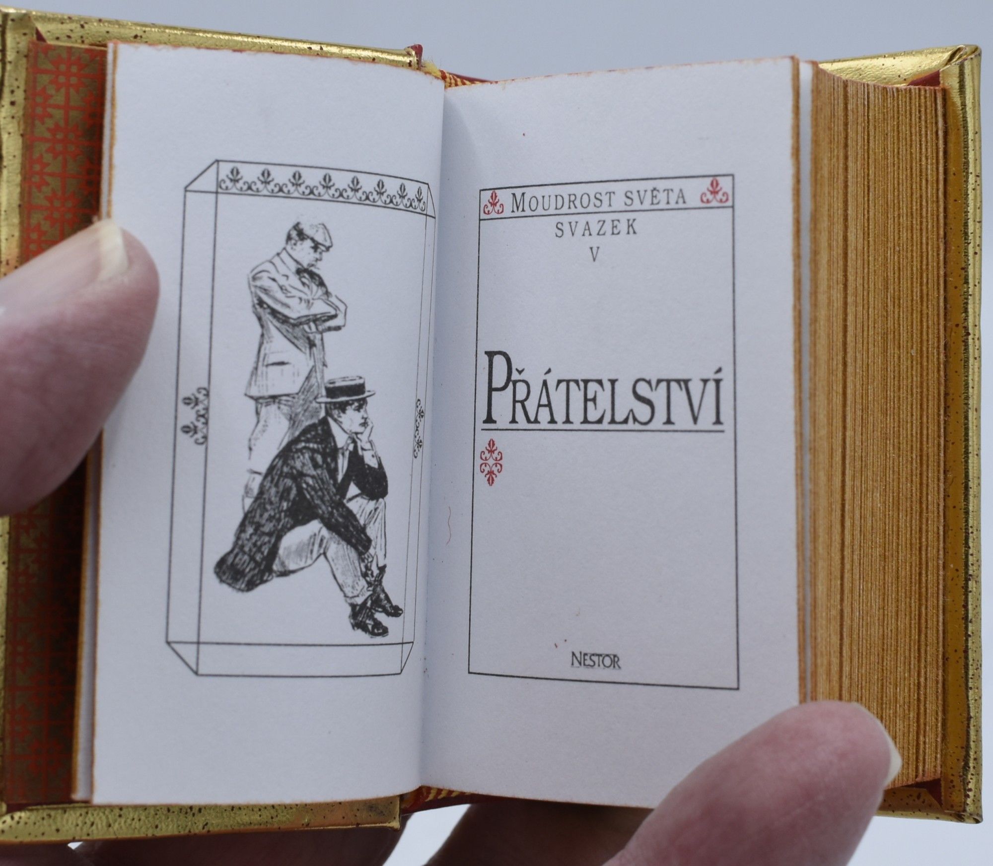 Nestor, 2002. Hard Cover. Near Fine binding. A Czech miniature book on friendship. From Nestor's 'Wisdom of the World' series. Text in check, with simple borders to the text, and a few illustrations. Faux red leather, with decorations and lettering in gold and blue. All edges gilt. Housed in the publisher's paper case. Near Fine binding.