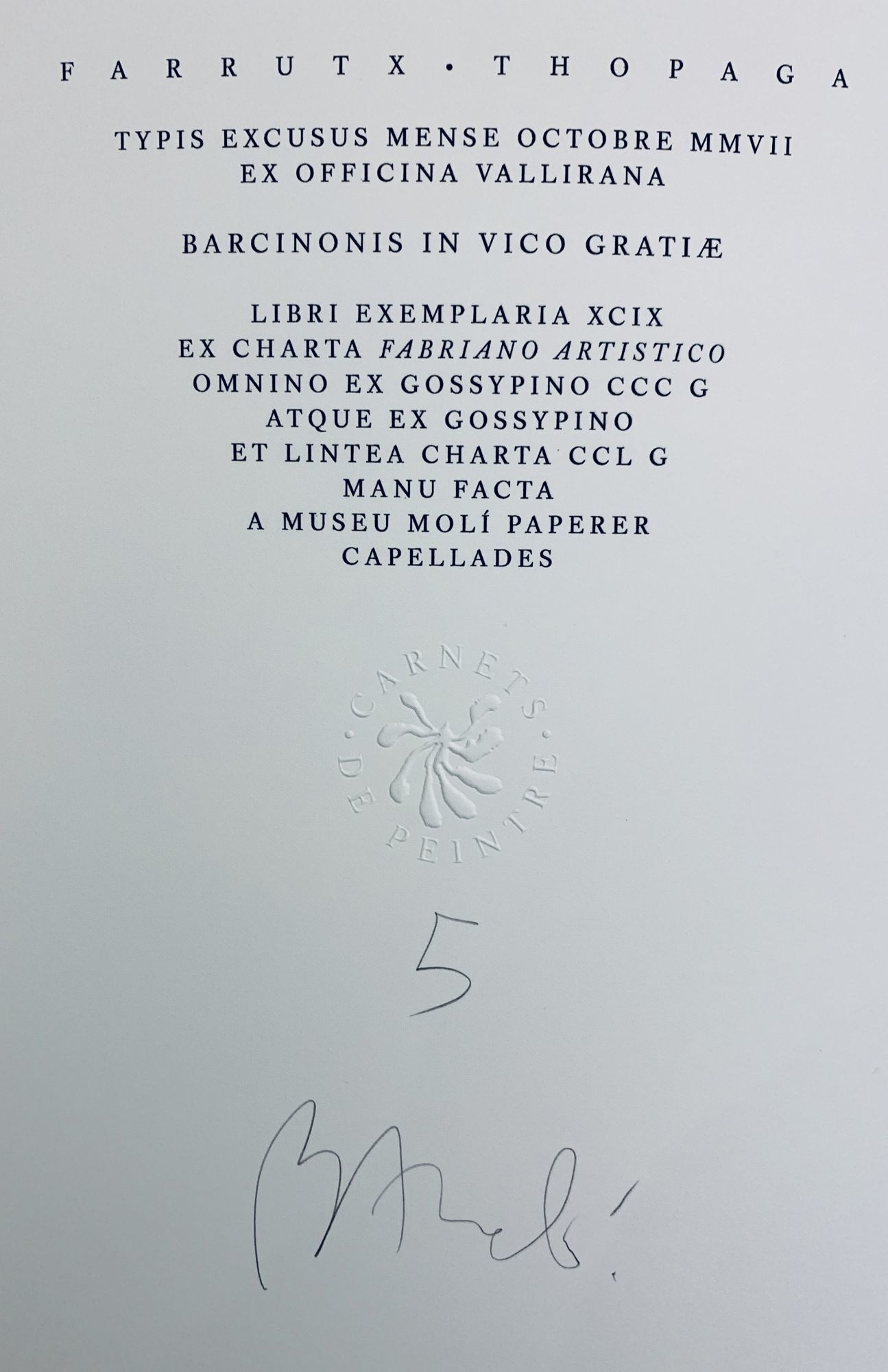 Barcelona, Spain: Carnets de Peintre, 2003. Limited Edition. Hardcover. Fine in Fine Archival Box. Limited Edition. Hardcover. 2002-2003. Miquel Barceló The artist’s handwritten pages have been transcribed under the supervision of José Díaz for printing at the Atelier du Livre d’Art et de l’Estampe at the Imprimerie Nationale.