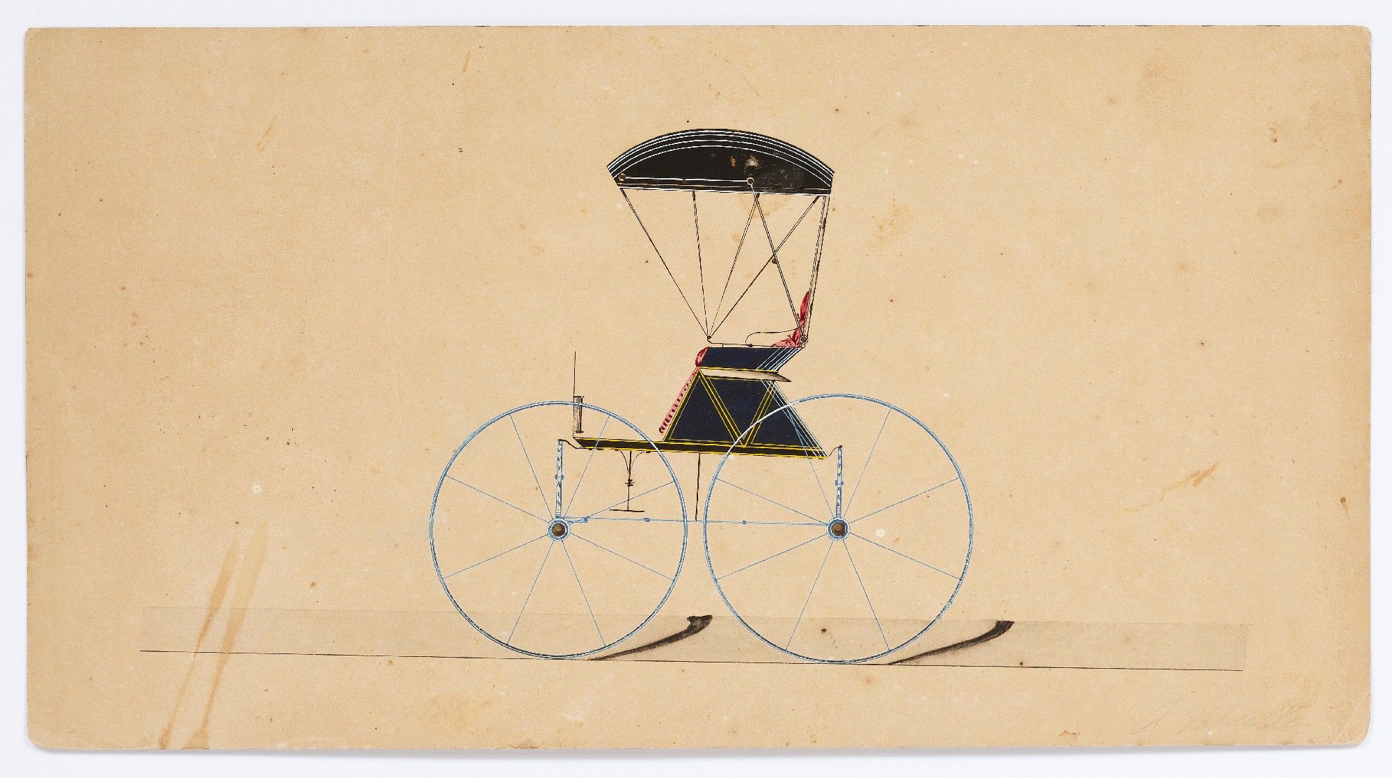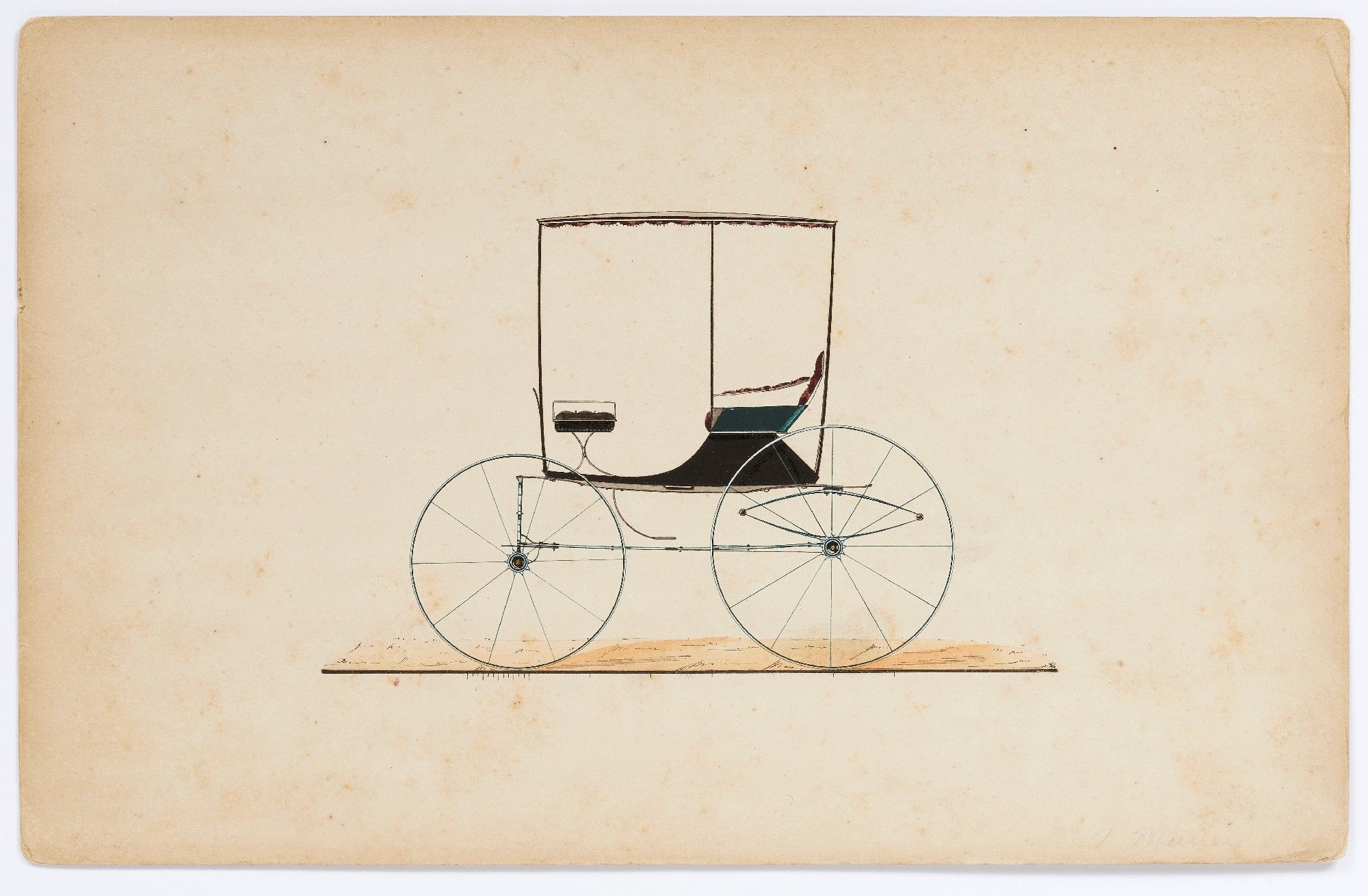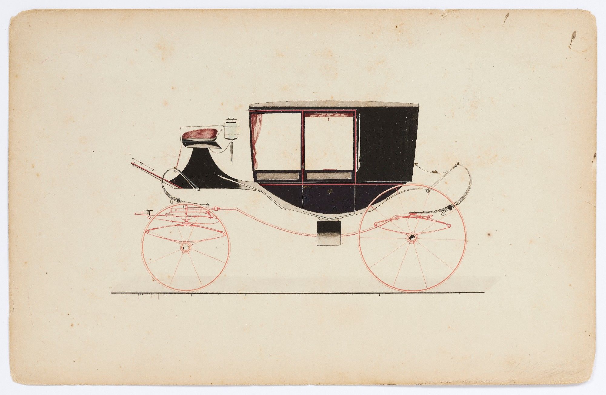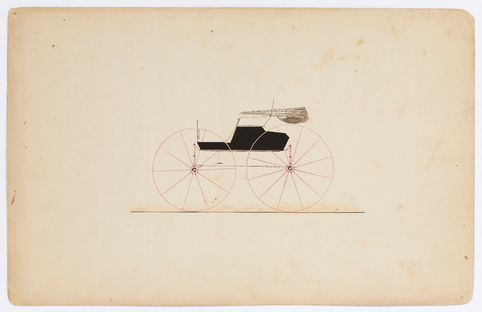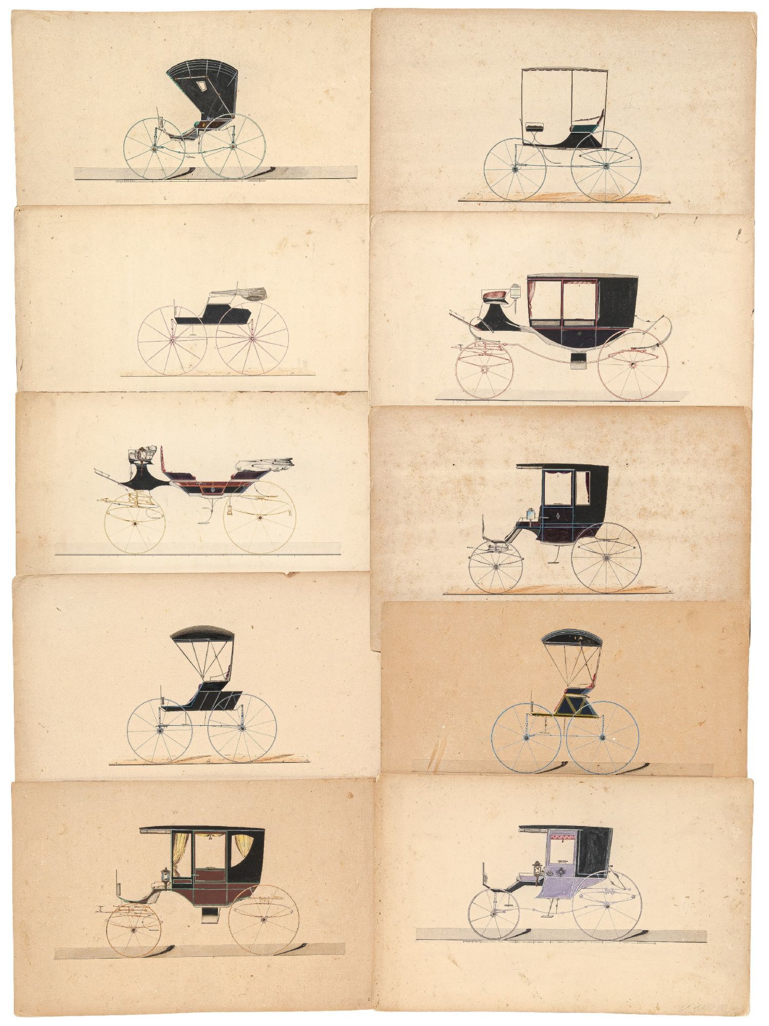 Unbound. Near Fine. Ten original drawings. Pen and ink with wash on card. Slight variations in size, most are approximately 10½" x 7". No artist name, place, date, captions or other identification. Some moderate foxing and small stains slightly affecting the images, corners a little worn, but mostly near fine. Frankly not our expertise, but probably English or American, and we'd speculate that they date from somewhere between 1800-50. Beautiful drawings of horse-drawn carriages ranging from one or two horse-drawn phaetons, cabriolets, and chariots to elaborate barouches. Very finely realized and technically authentic renderings.