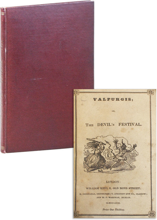 London: William Kidd, 1831. First Edition. Slim 12mo (16.5cm.); late 19th-century maroon cloth, gilt-lettered spine, original pictorial wrappers laid in; 35pp.; frontispiece and one additional plate by Robert Seymour. A hint of wear to cloth extremities, late 19th-century engraved ex-libris of a Gulielmi Gemmell, illustration signed in plate "E.G.," to front pastedown; mid-20th century ex-libris of Nathan Comfort Starr to front free endpaper; old bookseller's description tipped to p. [36] (blank). Very Good or better overall. Satirical verses inspired by Germany's annual Valpurgis night, first published in the London paper "Intelligence," with illustrations by Robert Seymour, best known for his contributions to the works of Dickens. BIBLIOTHECA DIABOLICA 1831, catalogued under the pseudonym "Facetiae," noting an 1833 edition illustrated by Cruikshank. At least one scholar tenuously attributes the text to author of the "Ingoldsby Legends" Richard Harris Barham based on stylistic similarities (see Graham E. Veritt, "English Caricaturists and Graphic Humorists of the Nineteenth Century" (1893), p. 216n).