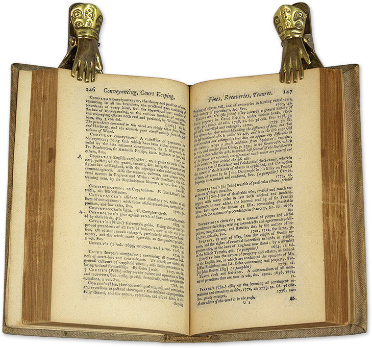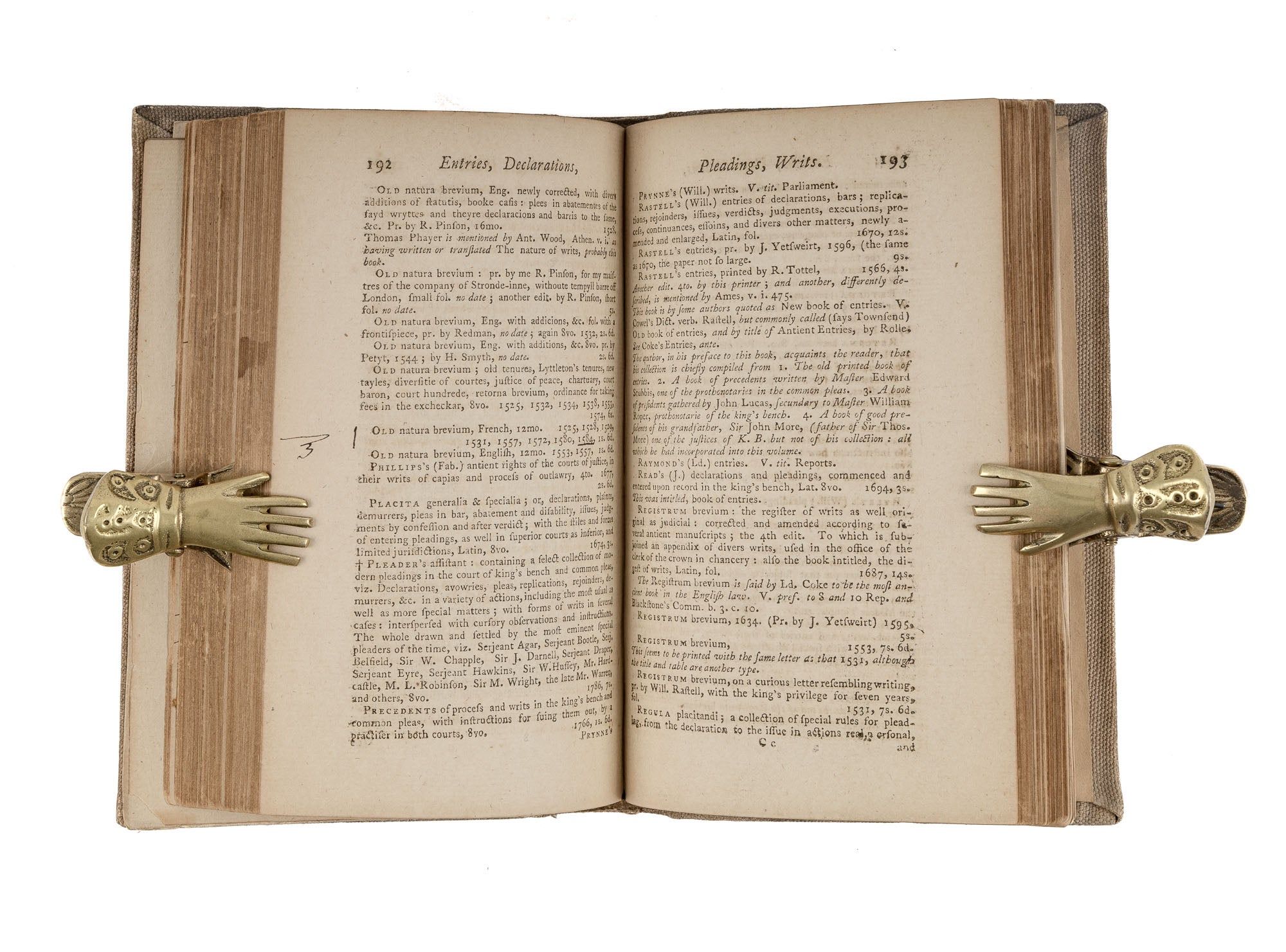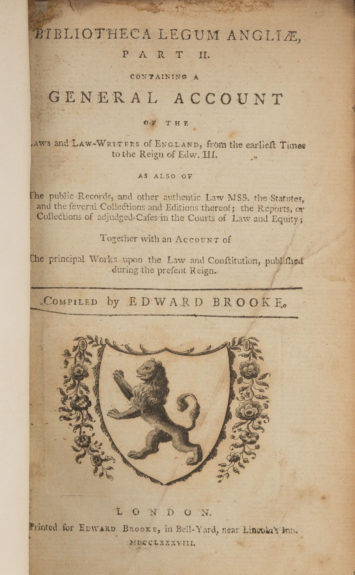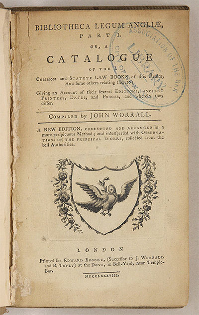 1788. The First Annotated English Legal Bibliography Worrall, John [d. 1771], Compiler. Brooke, Edward, Editor. Bibliotheca Legum Angliae, Part I. Or, a Catalogue of the Common and Statute Law Books of This Realm, and Some Others Relating Thereto; Giving an Account of Their Several Editions, Ancient Printers, Dates, and Prices, and Wherein They Differ. A New Edition Corrected and Arranged in a More Perspicuous Method, and Interspersed with Observations on the Principle Works, Collected from the Best Authorities. London: Printed for Edward Brooke, 1788. [xvi], 272, [26] pp. [And] Brooke, Edward. Bibliotheca Legum Angliae, Part II. Containing a General Account of the Laws and Law-Writers of England, From the Earliest Times to the Reign of Edw. III. As Also of the Public Records, And Other Authentic Law Mss. the Statutes, And the Several Collections and Editions Thereof; The Reports, Or Collections of Adjudged Cases in the Courts of Law and Equity; Together with an Account of the Principal Works upon the law and Constitution, Published During the Present Reign. London: Printed for Edward Brooke, 1788. viii, 255, [1] pp. 12mo. (6-1/2" x 4-1/2"). Early 20th-century tan library cloth, chipped red and black calf lettering pieces and paper shelf labels at foot of spines, endpapers added. Light shelfwear, moderate soiling and a few minor stains, some rubbing to edges of lettering pieces, preliminaries of Part I detached, crack in text block of Part II pp. 252 and 253. Light browning, upper corner of Leaf Dd2 (pp. 203-204) detached with minor loss to text, library stamps to title pages and a few other leaves, library marks to versos of title pages. $250. * The first annotated English legal bibliography, it remains an important reference due to its excellent annotations, many gathered from leading authorities of the time, and comparative bibliographical information. Worrall, believed to be the first bookseller to specialize in law books, issued the first edition in 1731, and published numerous editions during his lifetime. Part I is organized by topic and then alphabetically. Topics include abridgments, indexes, tables, civil, ecclesiastical, and universal law, common and crown law, dictionaries, trade, navigation, reports, statutes and Irish and Scottish law books. English Short-Title Catalogue T145167,
