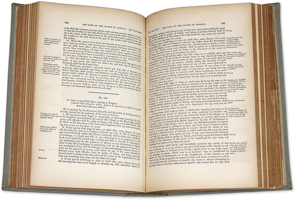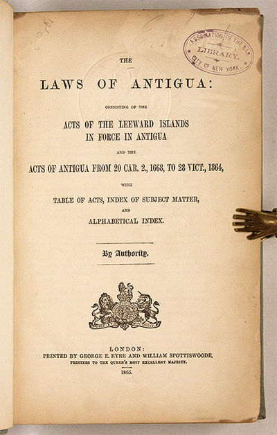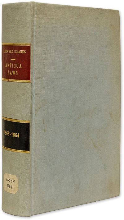 1864. Compiled Laws of Antigua in Force in 1865 [Antigua]. The Laws of Antigua: Consisting of the Acts of the Leeward Islands in Force in Antigua and the Acts of Antigua from 20 Car. 2., 1668, to 28 Vict., 1864, With Table of Acts, Index of Subject Matter, And Alphabetical Index. By Authority. London: Printed by George E. Eyre and William Spottiswoode, 1865. xxxi, 859 pp. Octavo (11" x 7-1/4"). Later library cloth, red and black calf lettering pieces to spine, endpapers added. Light shelfwear and soiling, moderate toning to text, light soiling, light edgewear and a few minor chips and tears to preliminaries, early owner signature and library stamp to title page, library marks to its verso, embossed institution stamp to preliminaries and a few other leaves. $1,500. * This is one of two retrospective compilations of Antigua's laws published during the nineteenth century. The first of these was issued in 1805. The 1865 compilation offers a view of Antigua during the early decades of its post-slavery plantation era. OCLC locates 16 copies, 8 in North America, 4 in law libraries (Columbia, LA County, University of Michigan, Yale). Sweet & Maxwell, A Legal Bibliography of the British Commonwealth 7:314.