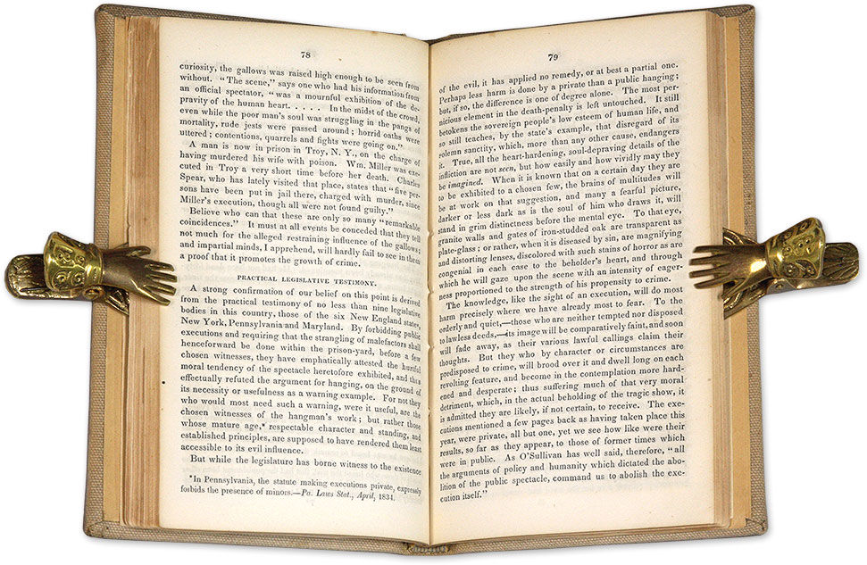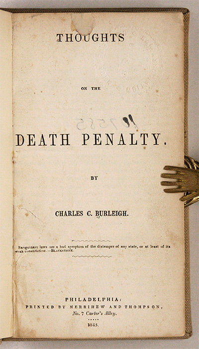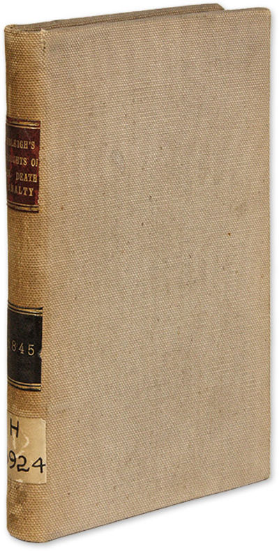1845. Philadelphia: Merrihew and Thompson, 1845.. Philadelphia: Merrihew and Thompson, 1845. Rare 1845 Essay Condemning Capital Punishment Burleigh, Charles C. [1810-1878]. Thoughts on the Death Penalty. Philadelphia: Printed by Merrihew and Thompson, 1845. 144 pp. Octavo (7-1/2" x 4-3/4"). Later library cloth, red and black calf lettering pieces and paper library shelf label to spine, endpapers renewed. Light soiling, front joint just starting at head, front hinge partially cracked, crack between rear endleaf and free endpaper. Moderate toning to interior, light soiling and faint embossed stamp to title page, a few library markings and repair to a short tear to verso, cellotape repairs to short tears on pp. 31, 32 and 33-34. $250. * First edition. A philosophical and religious argument against capital punishment. Its author was an ardent abolitionist and social reformer. A second edition was published in 1847. Both editions are rare. OCLC locates 3 copies of the first edition in law libraries (Harvard, Duke, Trial Courty Law Library). Cohen, Bibliography of Early American Law 3796.