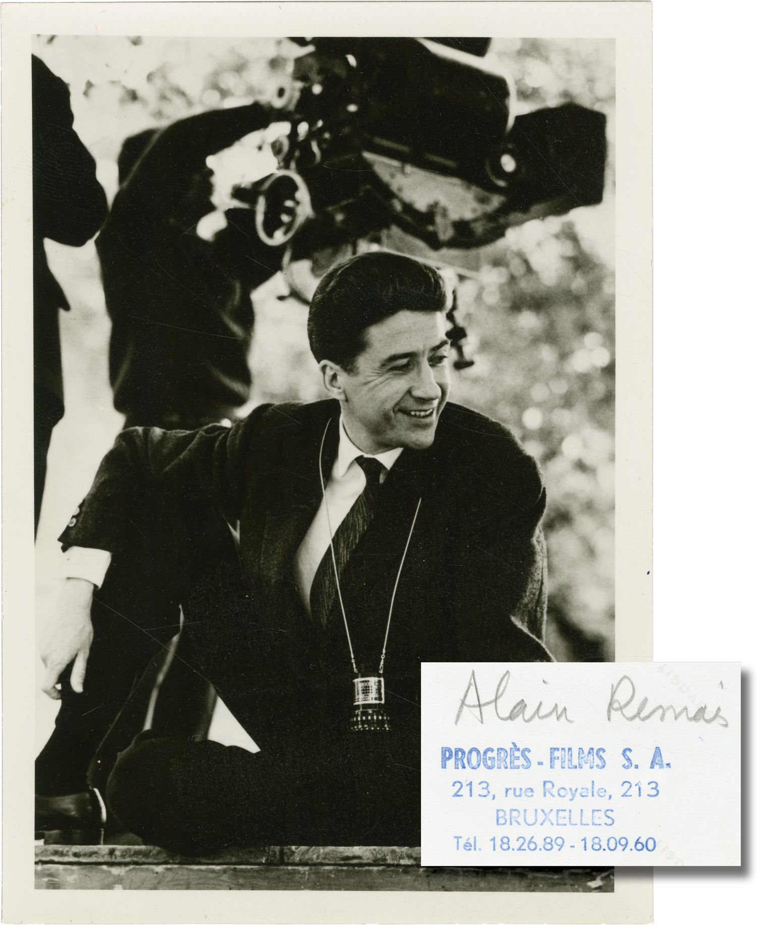 Paris: Cocinor, 1961. Vintage snapshot size photograph of Alain Resnais on the set of the 1961 film. With manuscript annotations in pencil and a press agency stamp on the verso of each.