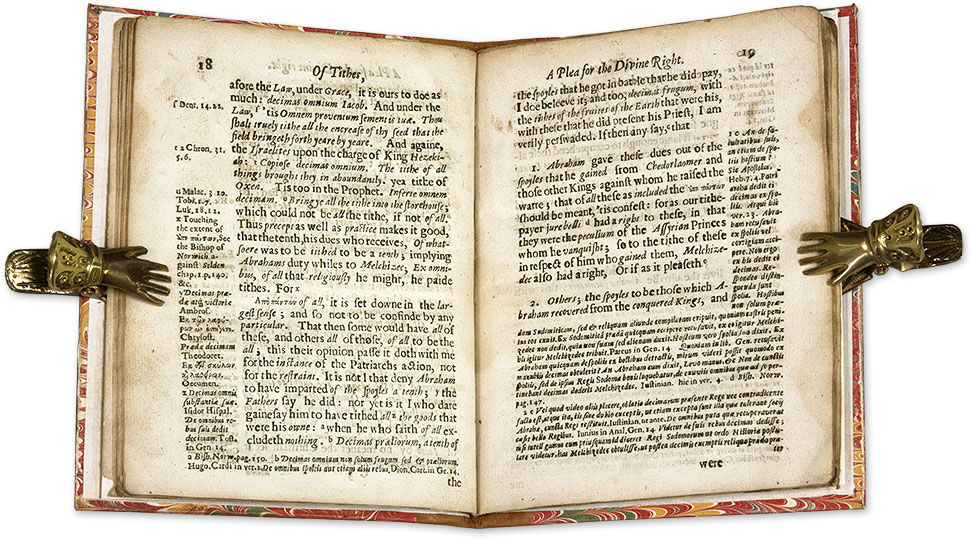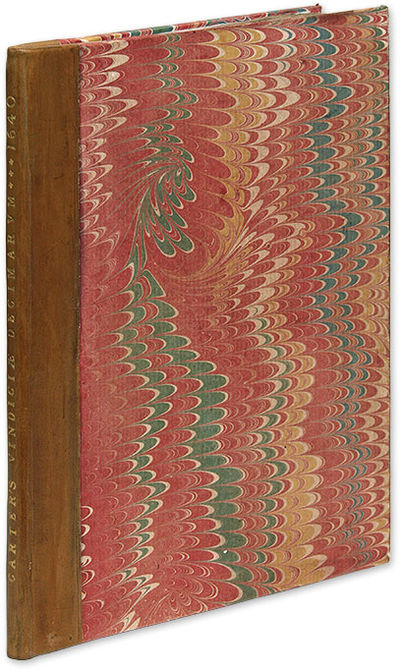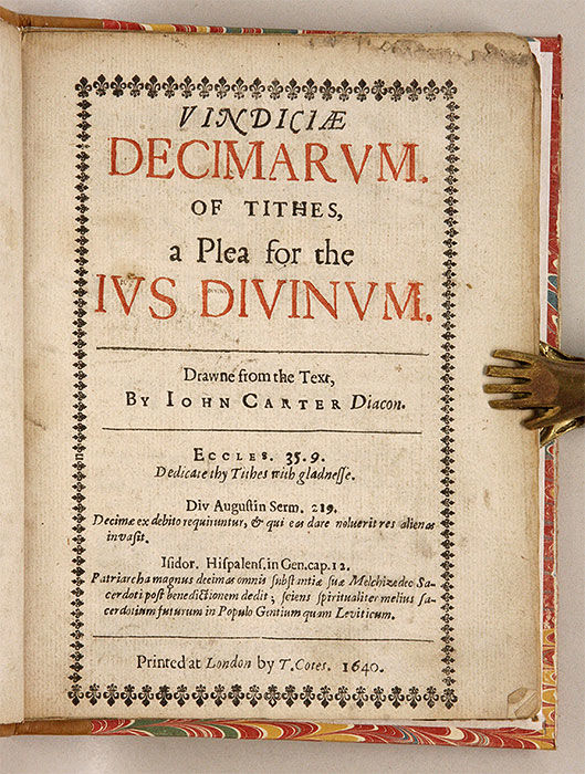1640. London: T. Cotes, 1640.. London: T. Cotes, 1640. Jus Divinum or Jus Divinum Regum? Carter, John. Vindiciae Decimarum. Of Tithes, A Plea for the Ius Divinum. Drawne from the Text. London: T. Cotes, 1640. (iv), 56 pp. First leaf blank. Quarto (7" x 5-1/4"). Stab-stitched pamphlet bound into recent period-style quarter calf over marbled boards, gilt title to spine, endpapers added. Title page printed in red and black within typographical border. Moderate toning occasional light soiling or staining to margins, faint early pen doodle to foot of final page. An appealing copy. $500. * Only edition. Ostensibly an academic study of tithes, this is a response to the opening phase of the intense conflict between Charles I and the Church of Scotland that would help push England into its civil war. Charles wanted to bring the Scottish church under state control and align its practices and creed with those of the Church of England. In 1638 Charles's opponents, or Covenanters, who drawn mostly from the Scottish nobility and clergy, declared their commitment to keep the church away from state control. The notion of tithes was a central point; the Covenanters argued for Jus Divinum, a belief that tithes are paid to the church. Charles believed in Jus Divinum Regum, which directed tithes to a state church through a monarch. OCLC and the ESTC locate no copies in North American law libraries. English Short-Title Catalogue S118338.