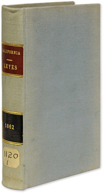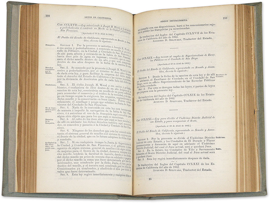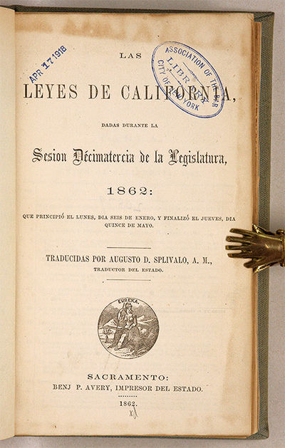 1862. Spanish-Language Edition of the 1862 California Session Laws [California]. Splivalo, Augusto D., Translator. Las Leyes de California, Dadas Durante la Sesion Decimatercia de la Legislatura, 1862; Que Principio el Lunes, Dia Seis de Enero, Y Finalizo el Jueves, Die Quinca de Mayo. Sacramento: Benj. P. Avery, 1862. xxxv, 445, [1], 40 pp. Three folding tables. Octavo (8-3/4" x 5-1/2"). Later library cloth, red and black calf lettering pieces and paper shelf label to spine, endpapers added. Light shelfwear and soiling, light rubbing to lettering pieces, faint stain to foot of spine. Moderate toning to text, light edgewear and a few minor tears to tables, library stamps to title page, a few library markings to verso. $450. * Only edition in Spanish. California session laws were issued in English and Spanish editions from the first session, 1849, to the fourteenth session, 1863. Spanish-language editions are scarce. OCLC locates 6 copies of the 1862 volume, 2 in law libraries (University of Michigan, University of Minnesota). Babbitt, Hand-List of Legislative Sessions and Session Laws 23.