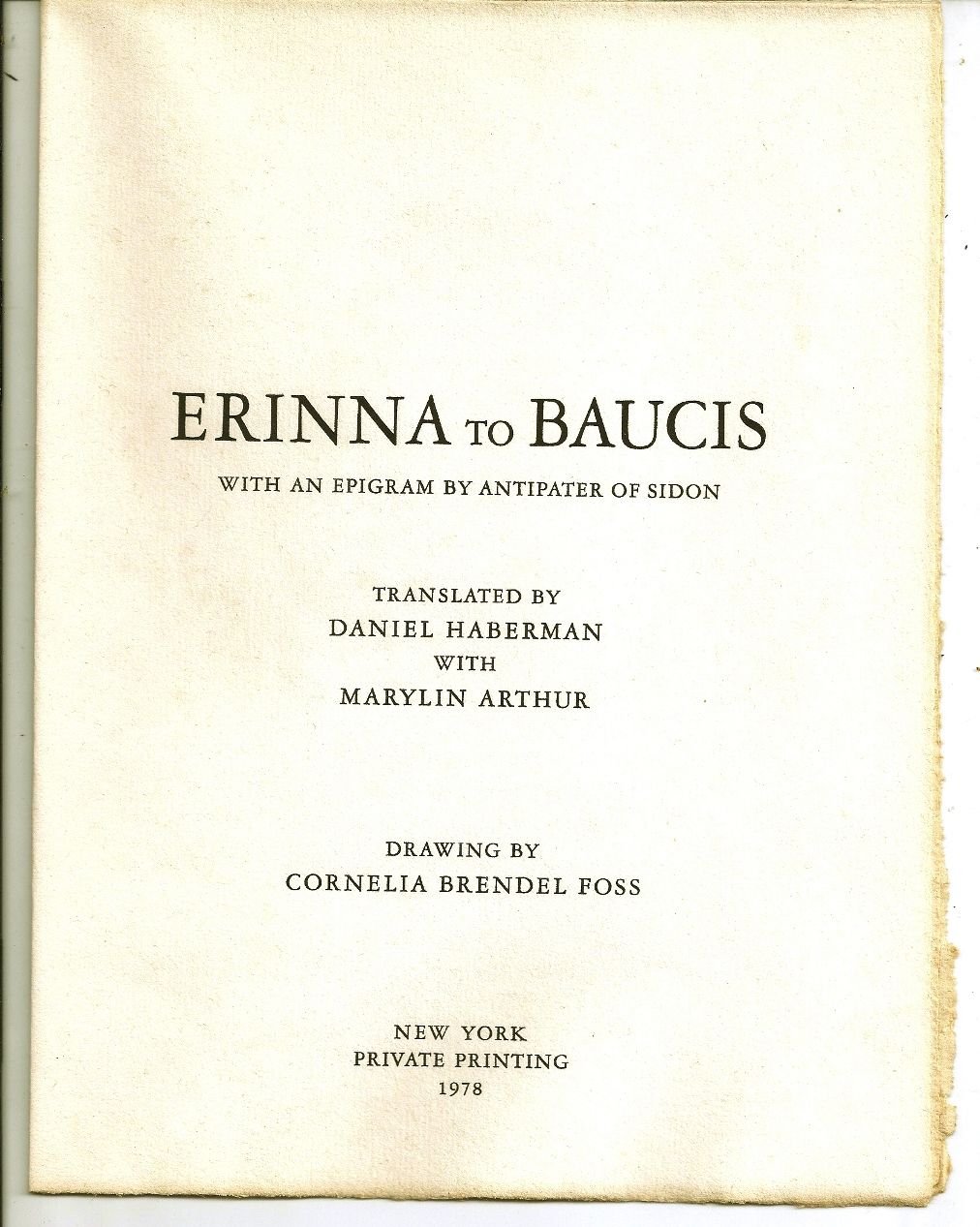 New York: Privately Printed, 1978. First Edition. Softcover. Fine. Two folio sheets folded into fours, 7-3/4" x 10-1/2", printing the papyrus fragment of the poem along with a full-page commentary by Marylin B. Arthur who did the translation along with Daniel Haberman. Drawing by Cornelia Brendel Foss. Copy #32 of 300 printed by hand on handmade paper and SIGNED by Haberman. This copy also INSCRIBED by Haberman to R'Lene Dahlberg, wife of Edward Dahlberg.