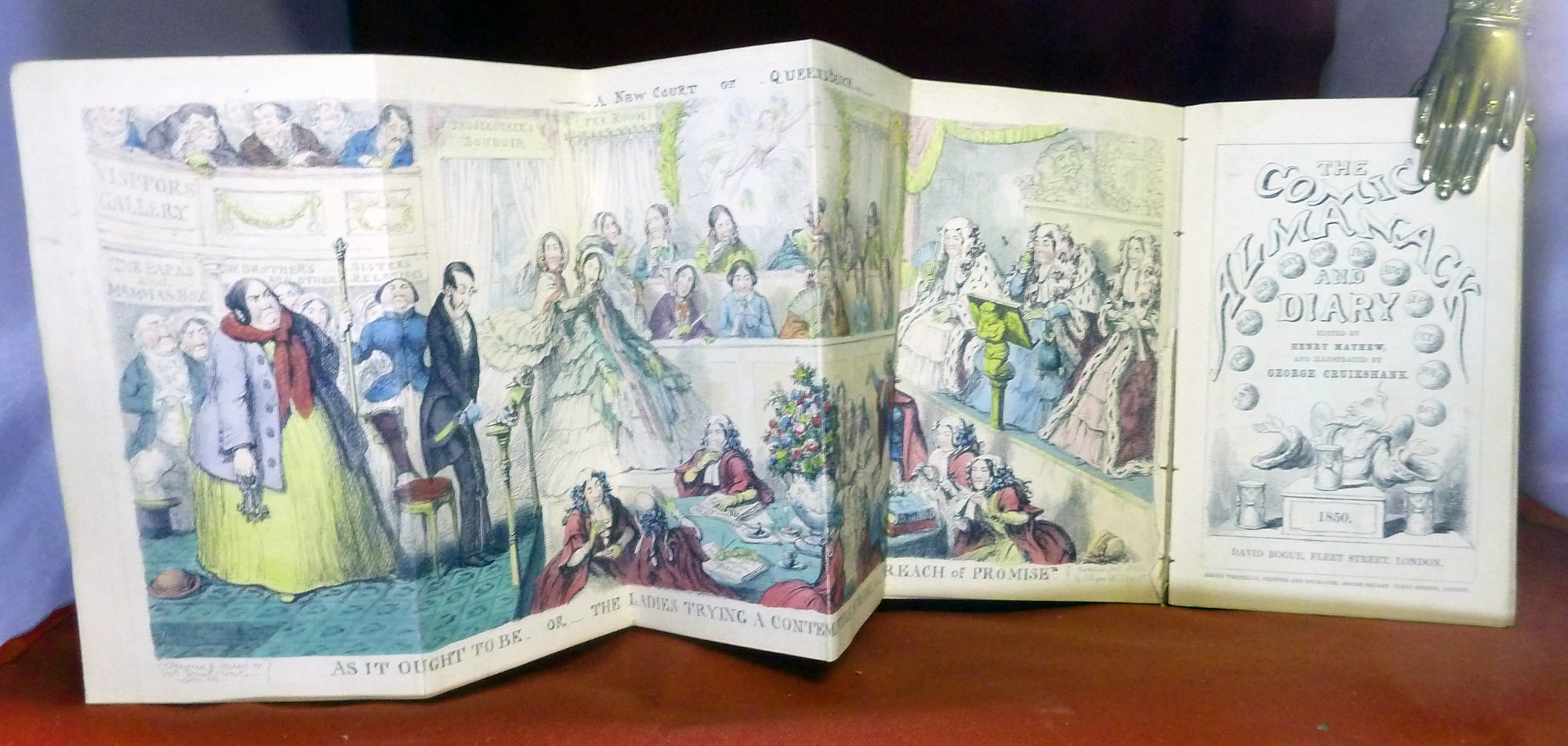 London: Charles Tilt / Tilt & Bogue / David Bogue, 1853. First edition. Hardcover. Housed in custom slotted board box with lid. Very good. Cruikshank, George. In the original parts. 17 x 11 cm., and 14 x 9 cm (1848-1849). 195 etched plates by Cruikshank, plus five fold-out plates, four in color. Thackeray contributed to the 1839-1840 issues. Contains practically all the first issue points noted by Cohn -- numbered pages of adverts at front and unnumbered at rear, all little slips as called for, Beaufoys toothache ads, proper paper color of wrappers (with scarce first issue green wrapper for 1848), with Bogue's Annual Catalogue for 1847, with "very scarce" 1845 issue containing the "Fine Art Distribution" woodcut on p.32. COHN 184. Marginal toning to some full page plates, light wear to bindings, neat repairs to several backstrips and wrappers. All color fold-out plates bright, crisp and clean.