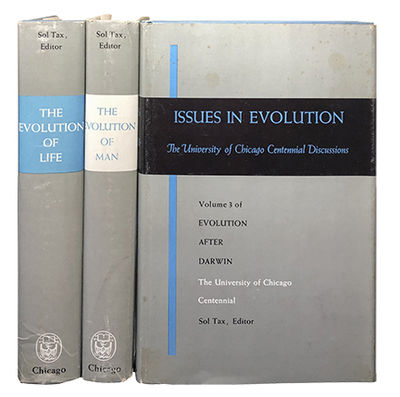 Chicago: University of Chicago Press, 1960. First Edition. Hardcover. Very Good/Very Good. Very Good in Very Good jackets, unclipped ($10.00, $10.00, $7.50), rubbed and with some surface staining. Grey and blue buckram bindings with black ink lettering on the spine. Square and firmly bound, former owner's name on the front endpaper of Volume 1, foxed at the top edges, clean otherwise. A seemingly unread set of this work that compiles the papers written and published during the five-day Darwin Centennial Celebration at the University of Chicago.
