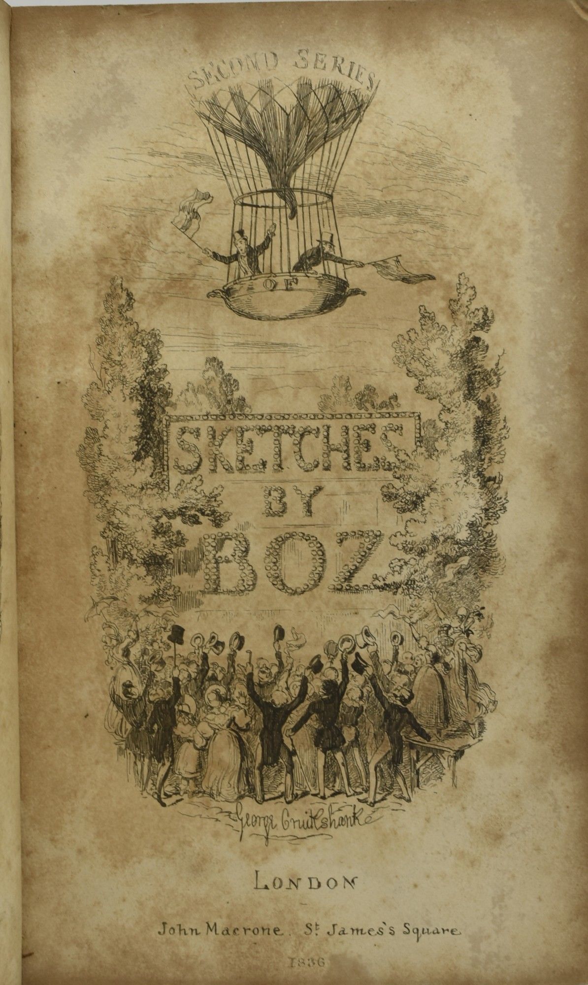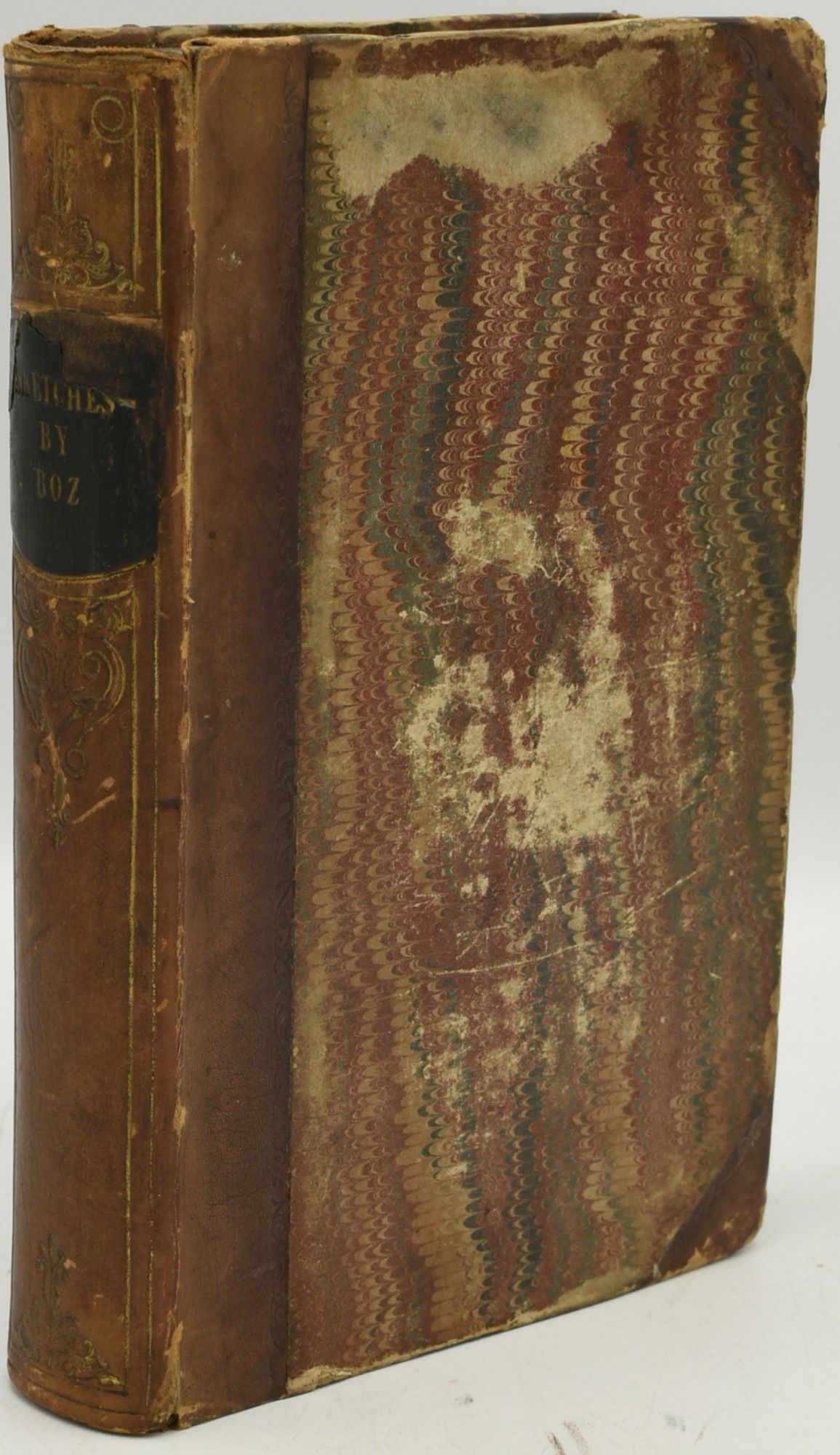 London: John Macrone, 1837. Second Series. Quarter Leather. Good binding. First Edition, Second Issue of Charles Dickens' first published book. Lacking the half title, 'Contents' leaf, and publisher's advertisement at the rear. With frontispiece; additional title page, engraved; and eight additional plates. Foxing to the plates and opposite pages. Rubbing to the boards; loss to the top edge of the spine and to the spine label. Half calf with remnants of a black leather label, over marbled paper boards. All edges marbled. (John C. Eckel First Editions of the Writings of Charles Dickens, 12-13 pp.). Good binding.