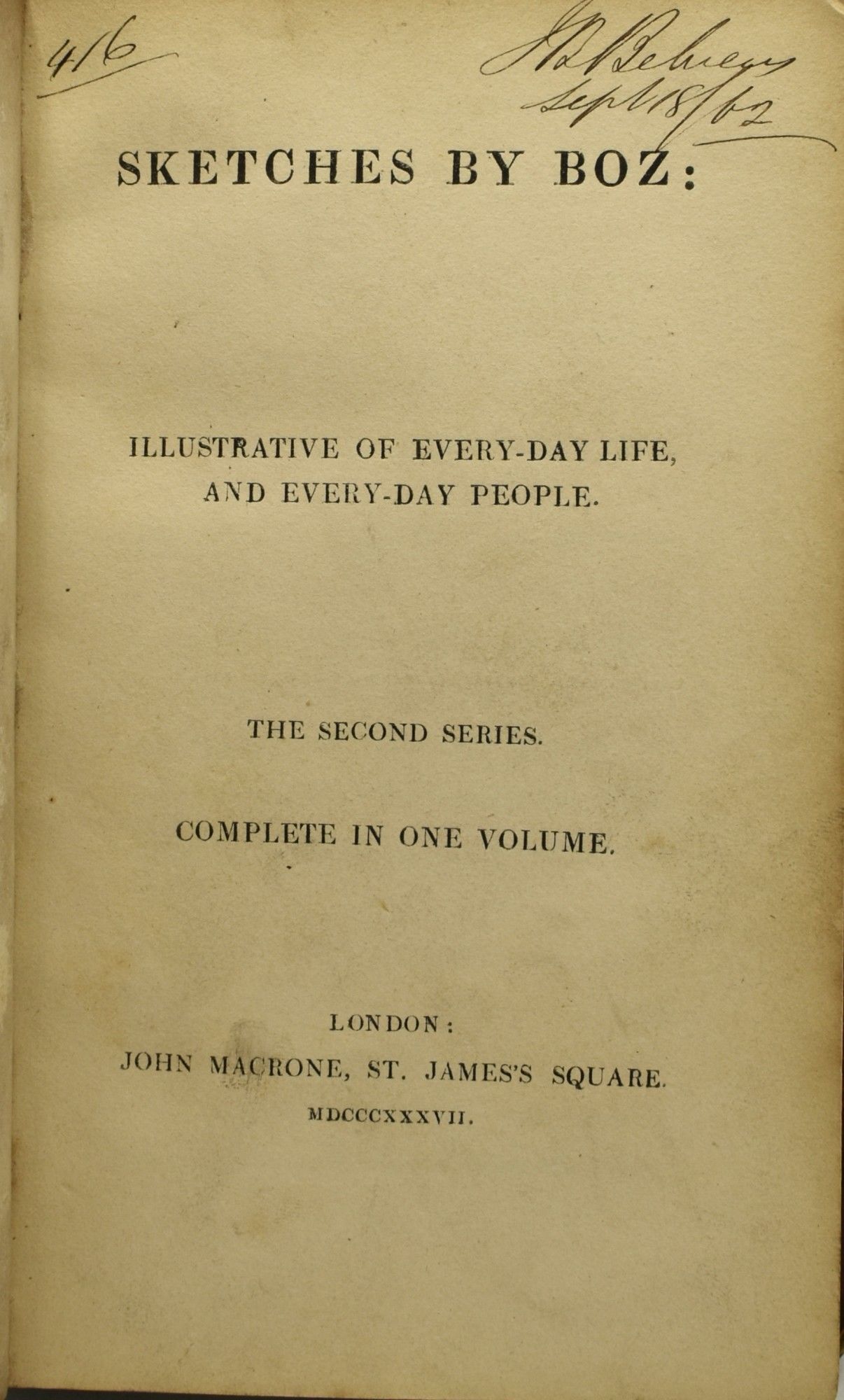 SKETCHES BY BOZ: ILLUSTRATIVE OF EVERY-DAY LIFE, AND EVERY-DAY PEOPLE. THE SECOND SERIES. COMPLETE IN ONE VOLUME