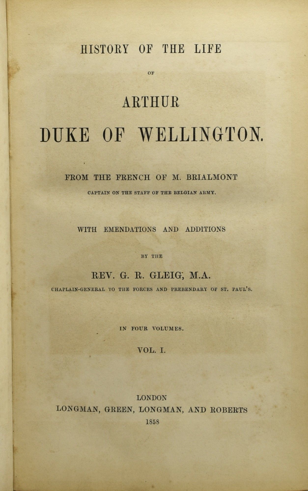 HISTORY OF THE LIFE OF ARTHUR DUKE OF WELLINGTON. FROM THE FRENCH OF M. BRIALMONT, CAPTAIN ON THE STAFF OF THE BELGIAN ARMY. WITH EMENDATIONS AND ADDITIONS. IN FOUR VOLUMES. VOL. I II III IV. (FOUR VOLUMES)