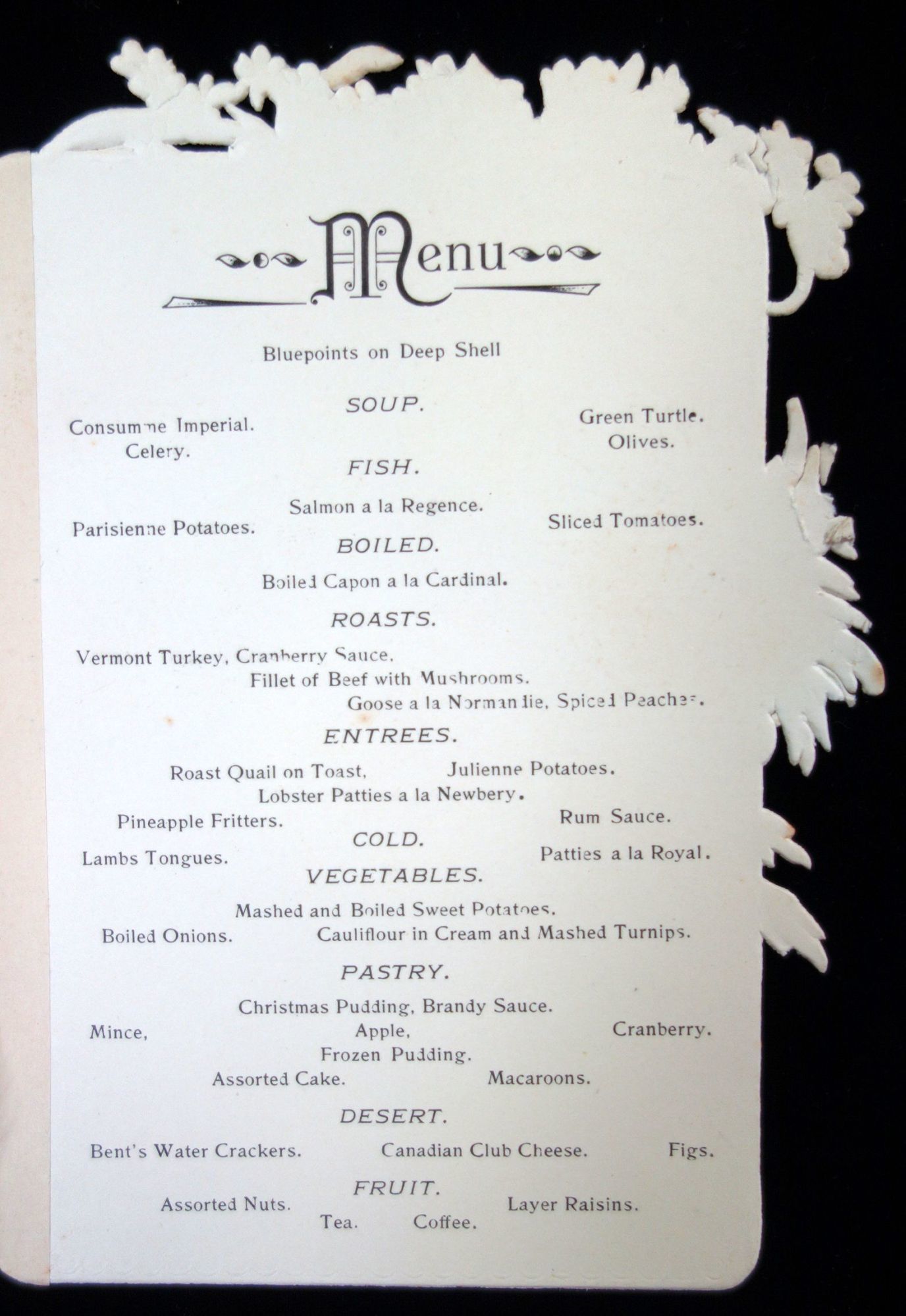 Folded die-cut paper menu, elaborate flowers with glitter decorate the front cover, inside lists menu, back has the image of the Hotel Colson; H.W.P. Colson, Prop., and Harry H. Goodnow, Mgr. Menu features Bluepoints on Deep Shell; soups-consumme imperial, celery, green turtle, olives; fish-salmon a la Regence with Parisienne potatoes and sliced tomatoes; roasts- Vermont turkey and cranberry sauce, fillet of beef with mushrooms, goose a la Normandie and spiced peaches; entrees-roast quail on toast, julienne potatoes, lobster patties a la Newbery, pineapple fritters, rum sauce; cold-lambs tongues and patties a la royal; vegetables-mashed and boiled sweet potatoes, boiled onions, cauliflour in cream and mashed turnips; pastry-Christmas pudding, brandy sauce, mince, apple, cranberry, frozen pudding, assorted cake, macaroons; dessert-Bent's water crackers, canadian club cheese, figs; and fruit-assorted nuts, layer raisins, tea and coffee.
