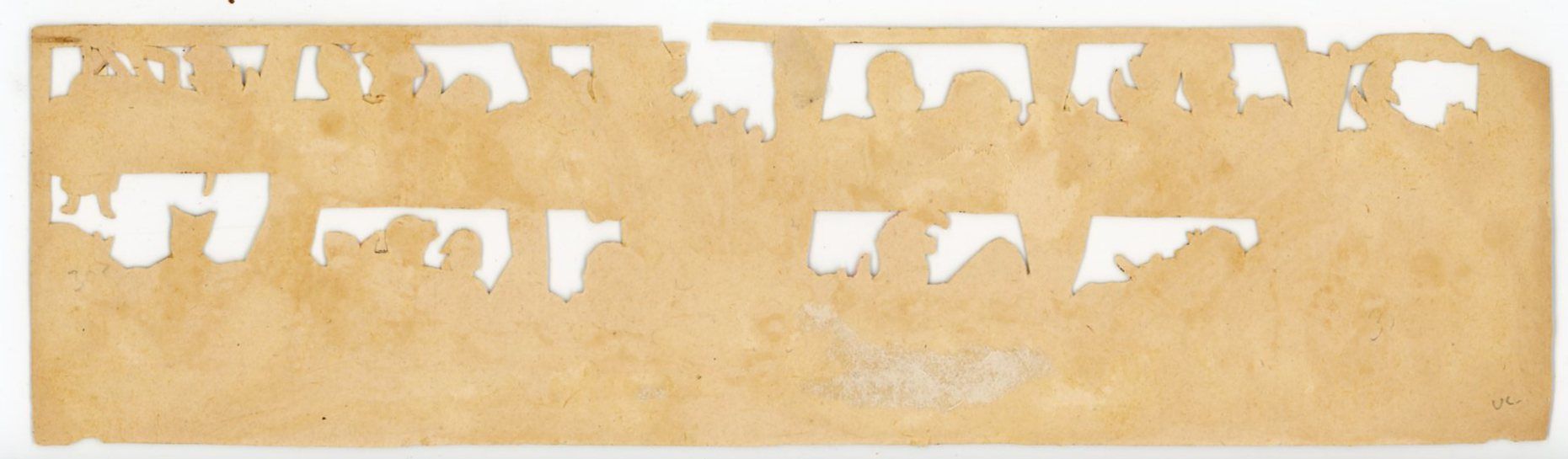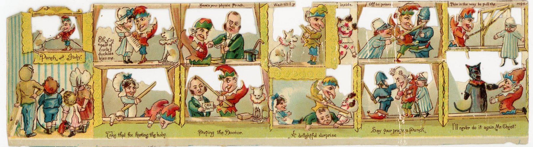 1890. At least one small section on the top is missing, which effects the text in that window. There is a small section of missing surface litho on the right side.. Tells one of the classic Punch and Judy stories in a die cut multi-panel picture book. The story is meant to be read through a series of windows reading left to right. The story starts with several small children surround a toy theater. Each subsequent second is the stage of the toy theater. There are ten scenes shown with small text descriptions of each one. The story starts of with Punch and Judy happily holding their baby while their dog, Toby, looks on. As the story progresses, various other classic characters show up, such as the policeman, the doctor, and Joey the Clown. The last scene show him meeting a ghost, where on his knees Punch claims "I'll never do it again, Mr. Ghost!" In each section the characters are shown in colorful outfits and props and sections of the back ground have been cutout to emphasize the action in the foreground. Embossed die-cut scrap story sheet. Measures 8 3/4" x 2 1/2