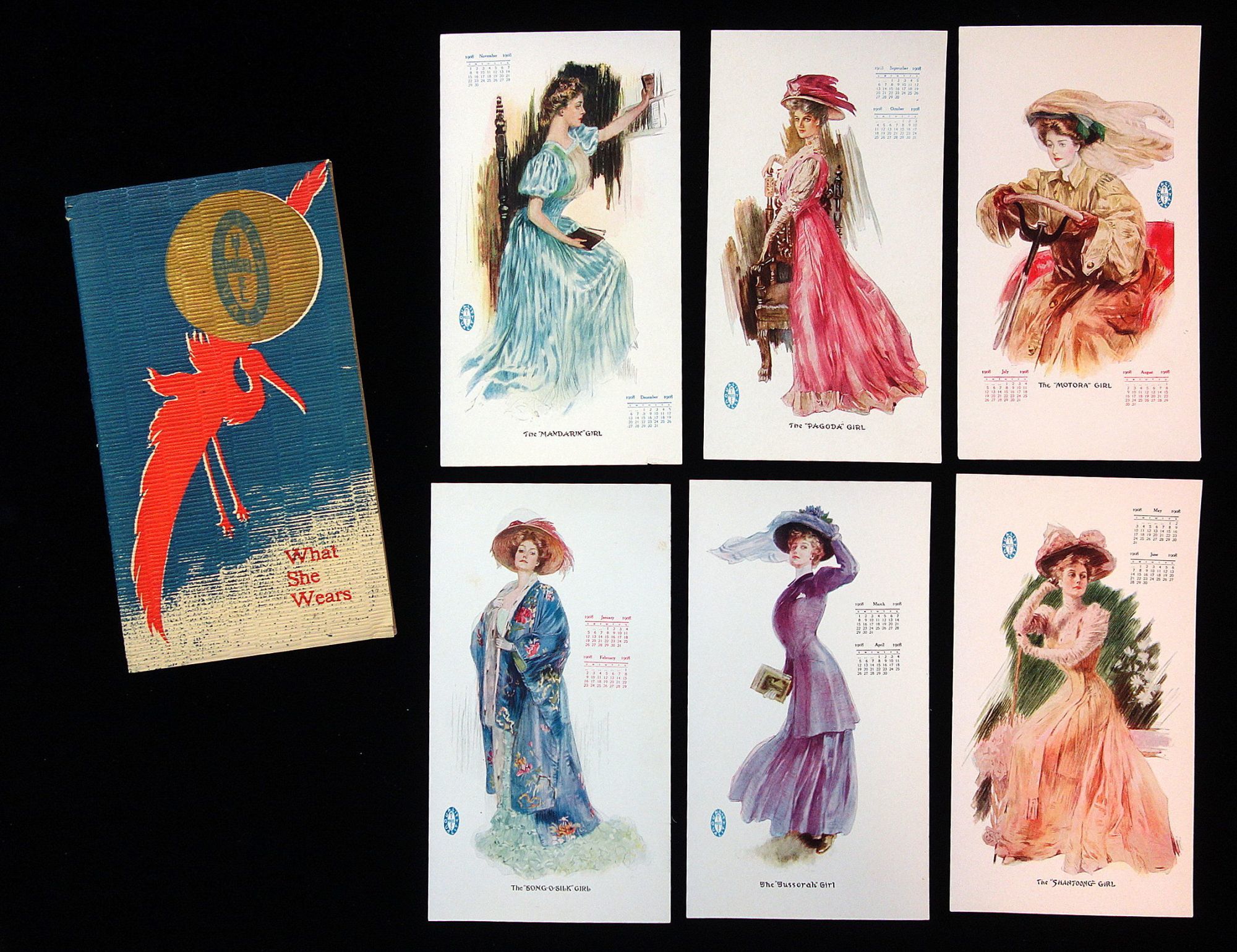 New York & Paris: M. C. Migel & Co, 1908. 8 french-fold pp. with silk screened crane on wraps. The paper for the cover is laid paper with chain lines. The paper for the booklet is more of a washi paper with chain lines. All quite striking. The booklet describes the fine silks produced by the company and the various silk types that include Mandarin, Pagoda, Tussorah, Shantoong, Montora and Song-o-Silk. Line drawn in text illustrations relevant to the silk being discussed. It concludes with the meaning of colors e.g. Blue, or the sapphire, expresses heaven, the firmament, truth from a celestial origin, the color denoting constancy, fidelity. This is accompanied by six (6) lithograph light stock calendar pages, each depicting a stately woman, drawn in the style of Charles Dana Gibson adorned in a garment made of silk. Each page also has two calendar months for 1908 and is captioned " The Mandarin, Pagoda, Tussorah, Shantoong, Montora or Song-o-Silk Girl", each in the colors described in the meaning of colors section. Calendar pages tuck neatly into the booklet. Booklet measures 9 1/4" x 5 1/8" What woman wouldn't want to purchase a garment of Migel silk and magically look like one of the influencers on the calendar pages.