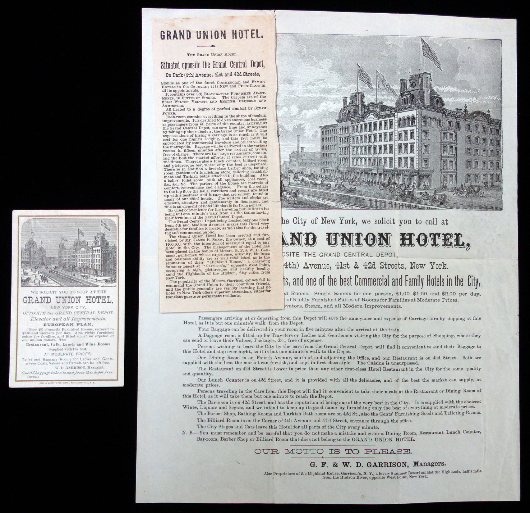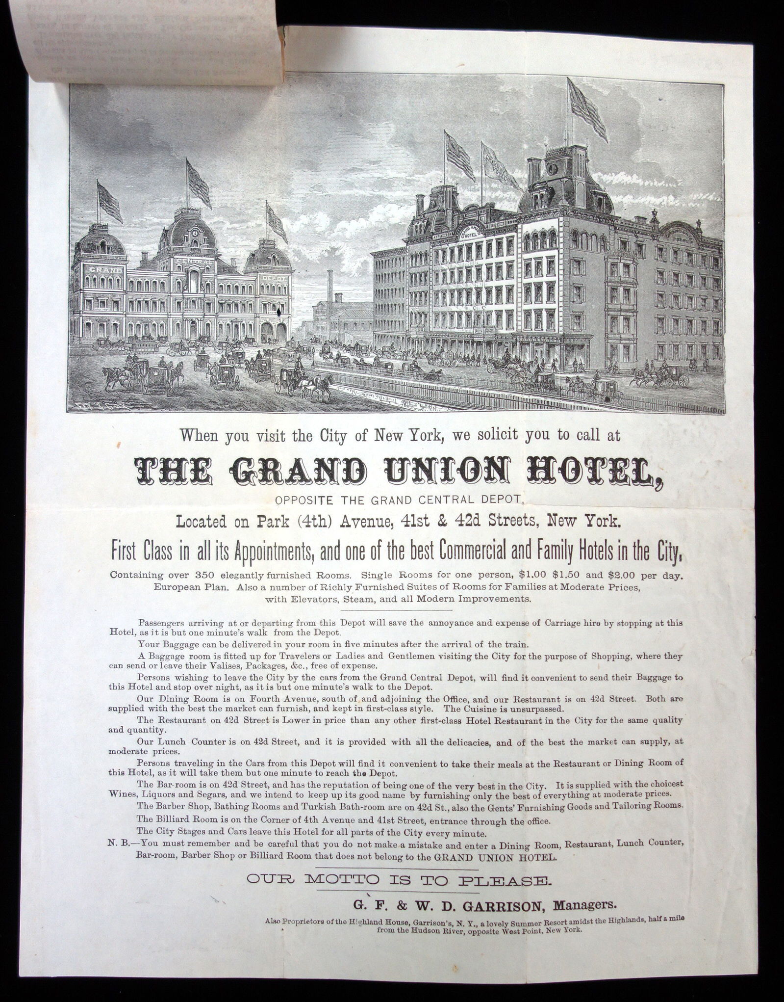 Leve & Alden. An 8 1/2" x 11" broadside with a large fine line illustration of the exterior of the Grand Union Hotel and the near by Grand Central Depot and surrounding street scene. The narrative explains the hotel and its amenities. A larger font at the base reads "Our Motto is to Please". G. F. & W. D. Garrison, Managers. A tip-on provides additional detail on the fine features of the hotel. This is accompanied by a 2 1/2" x 4" business or trade card with an similar illustration to that of the broadside. This includes information on the hotels European Plan and information on their restaurants and food service. The reverse provides a space for Memoranda. Letter folds; otherwise fine.