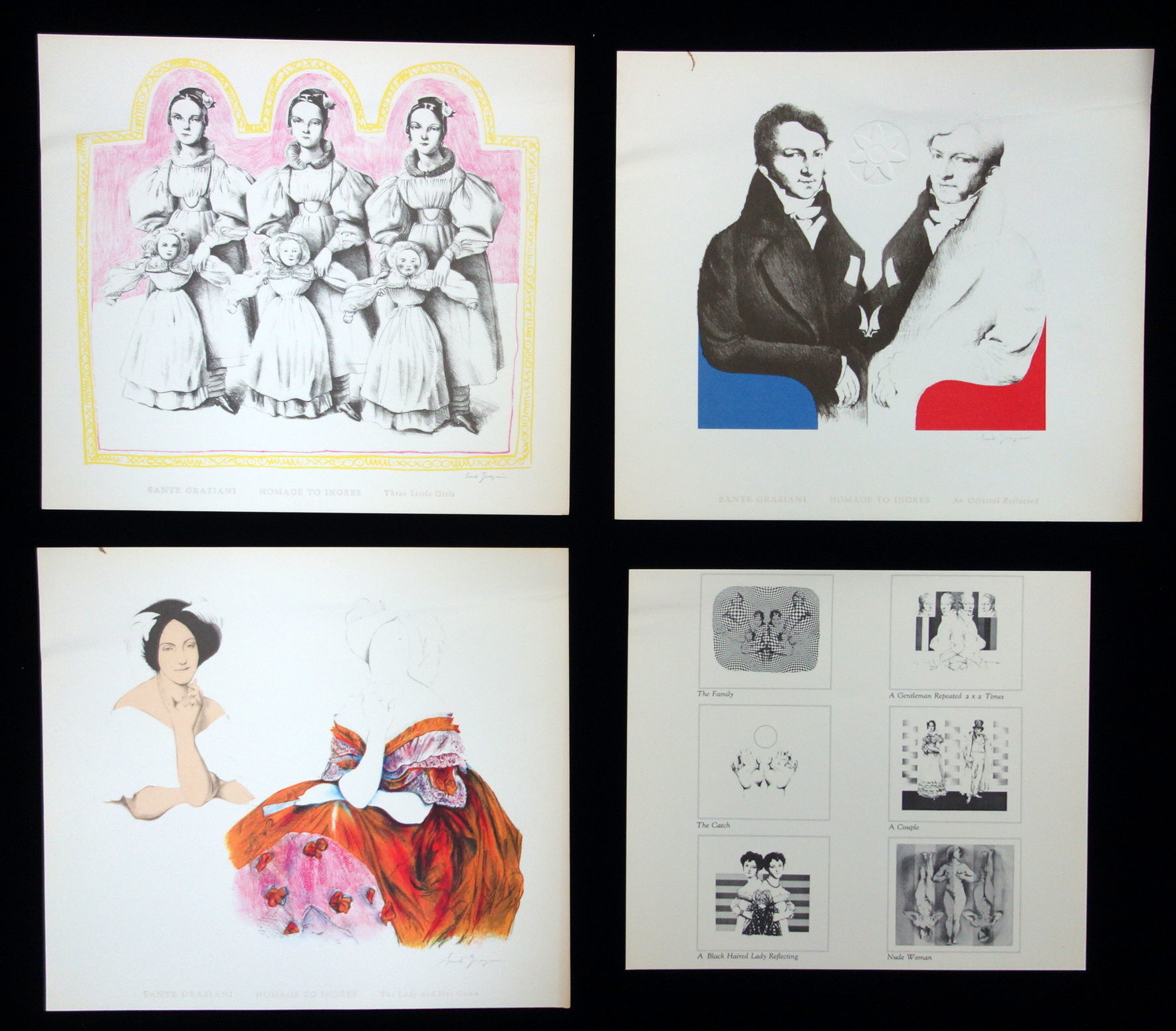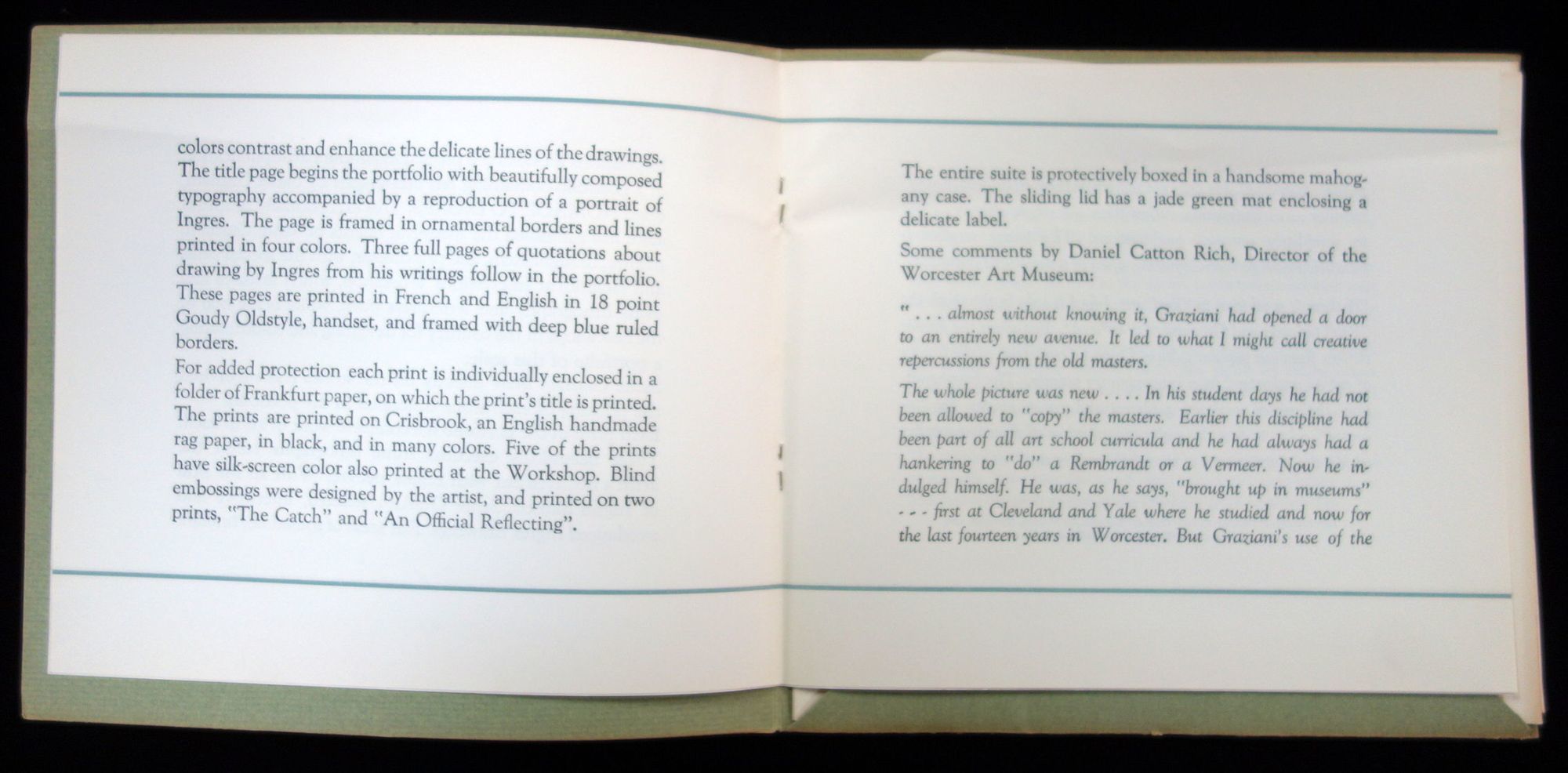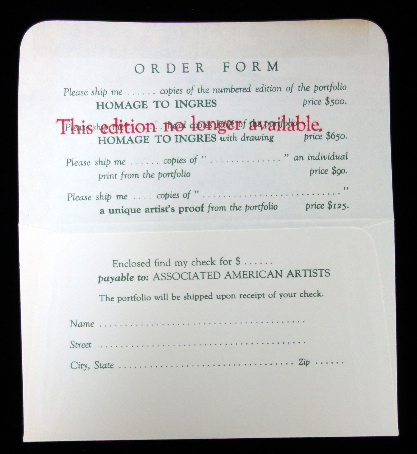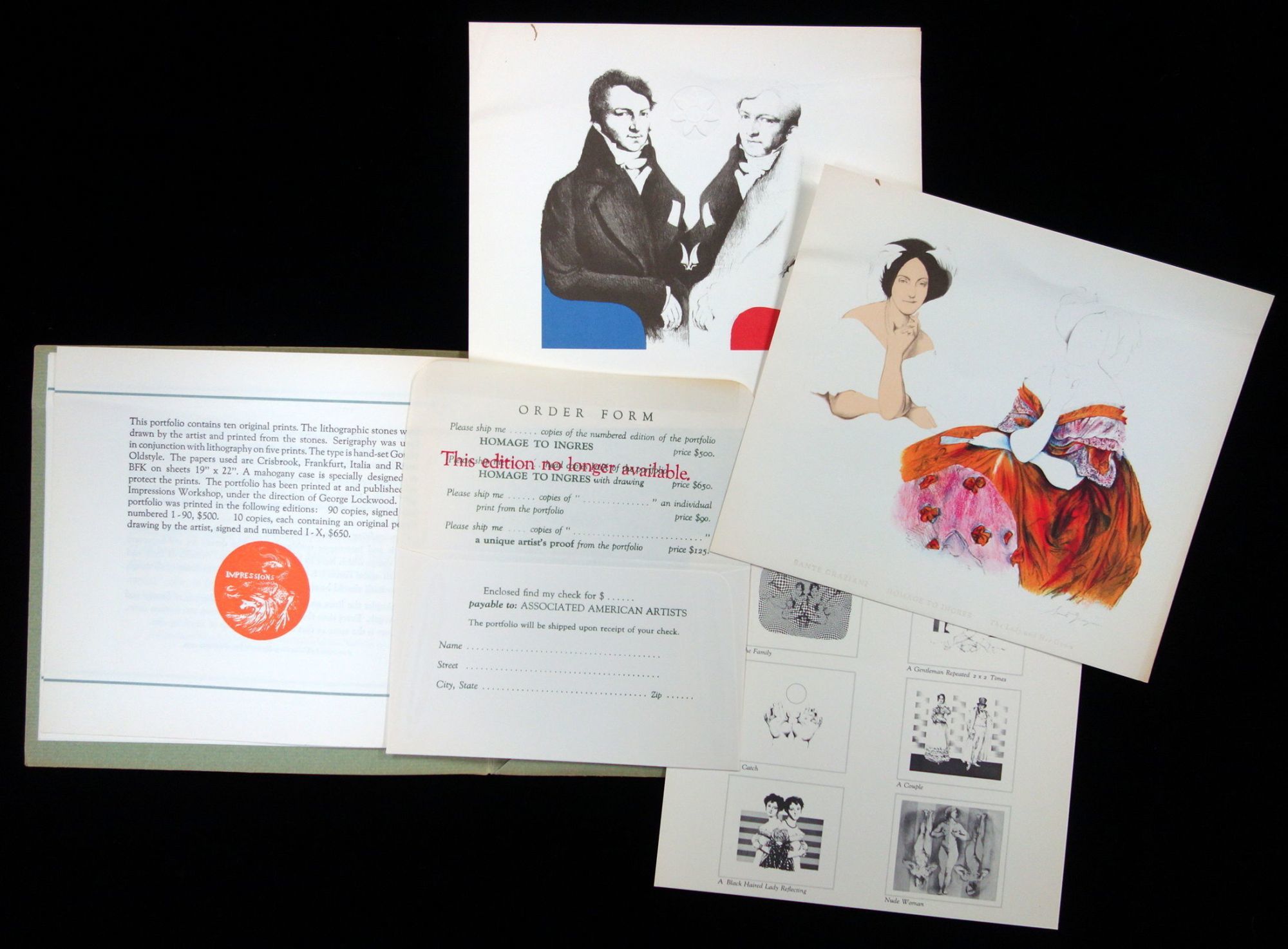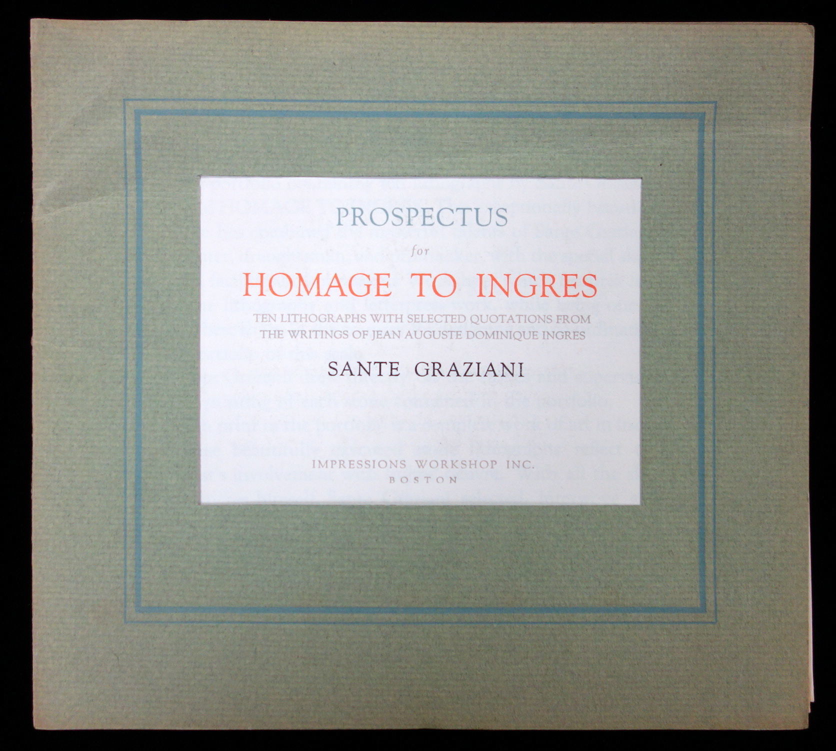 Boston: Impressions Workshop, Inc, 1965. Prospectus booklet, stamped soft cover with cut out to title page, text with border and stamped image at end of chapter, fold in back cover houses sample lithographs and contact sheet as well as an unused order form. The booklet explains the contents and purpose of "Prospectus for Homage to Ingres: Ten Lithographs with Selected Quatations from the Writings of Jean Auguste Dominique Ingres." Three color sample lithographs by Sante Graziani are included with a black and white contact sheet with six litho samples. The last paper included is a preprinted unused order form envelope.