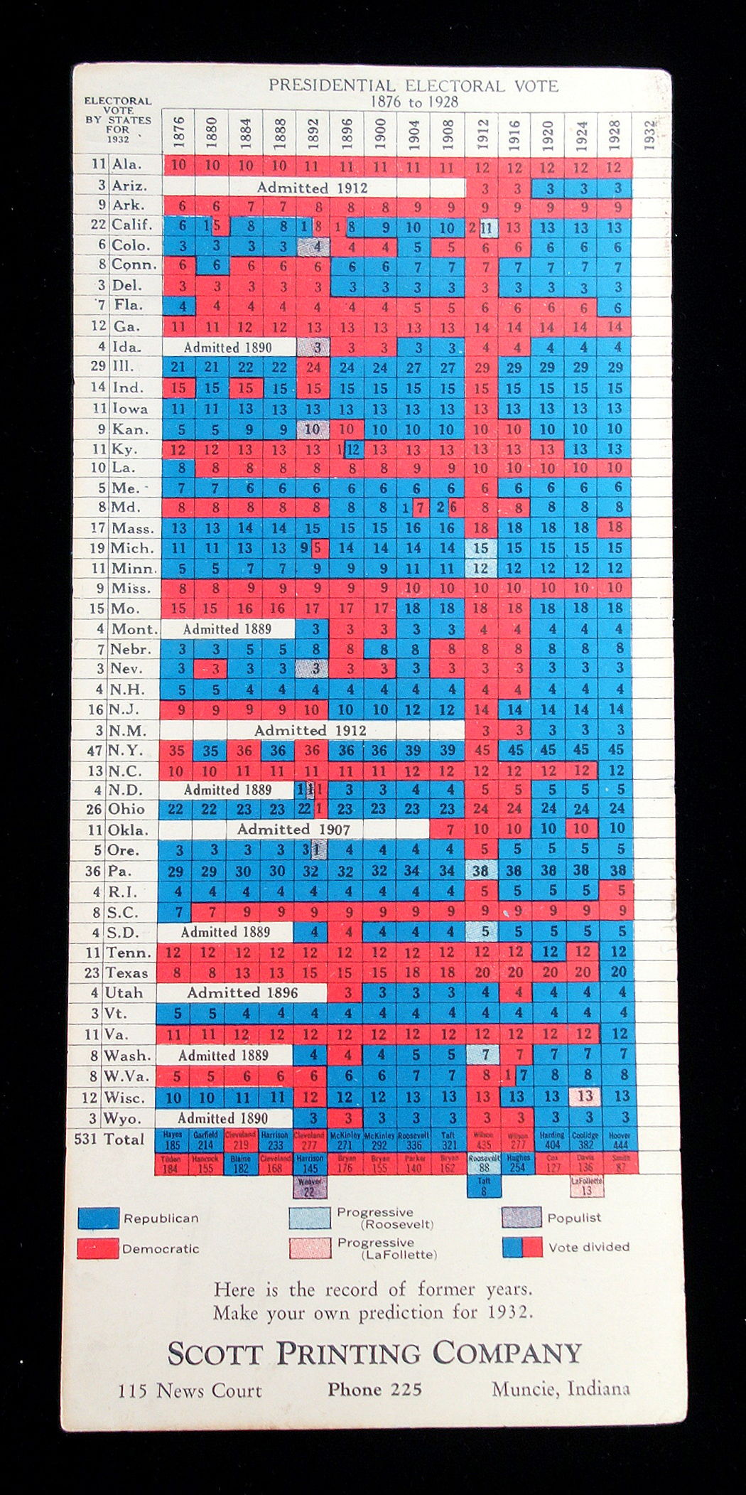 Muncie, Indiana: Scott Printing Company, 1932. This is a chart that tracks the electorial college vote for the Presidential elections from 1876 to 1928. The chart divides the depicts each of the votes by state and year. It also states how many electoral college votes each state gets and which political party was voted for: Republican, Democrat, Progressive (Roosevelt), Progressive (LaFollette), or Populist. The purpose of this chart was to inform voters of previous years so that they might be able to make their own predictions for the presidential election of 1932. Turns out Franklin D. Roosevelt won over Herbert Hoover by a landslide. Some edge wear, and slightly soiled. The blue backing is slightly detached in the corners. Otherwise fine. Measures 9" x 4"