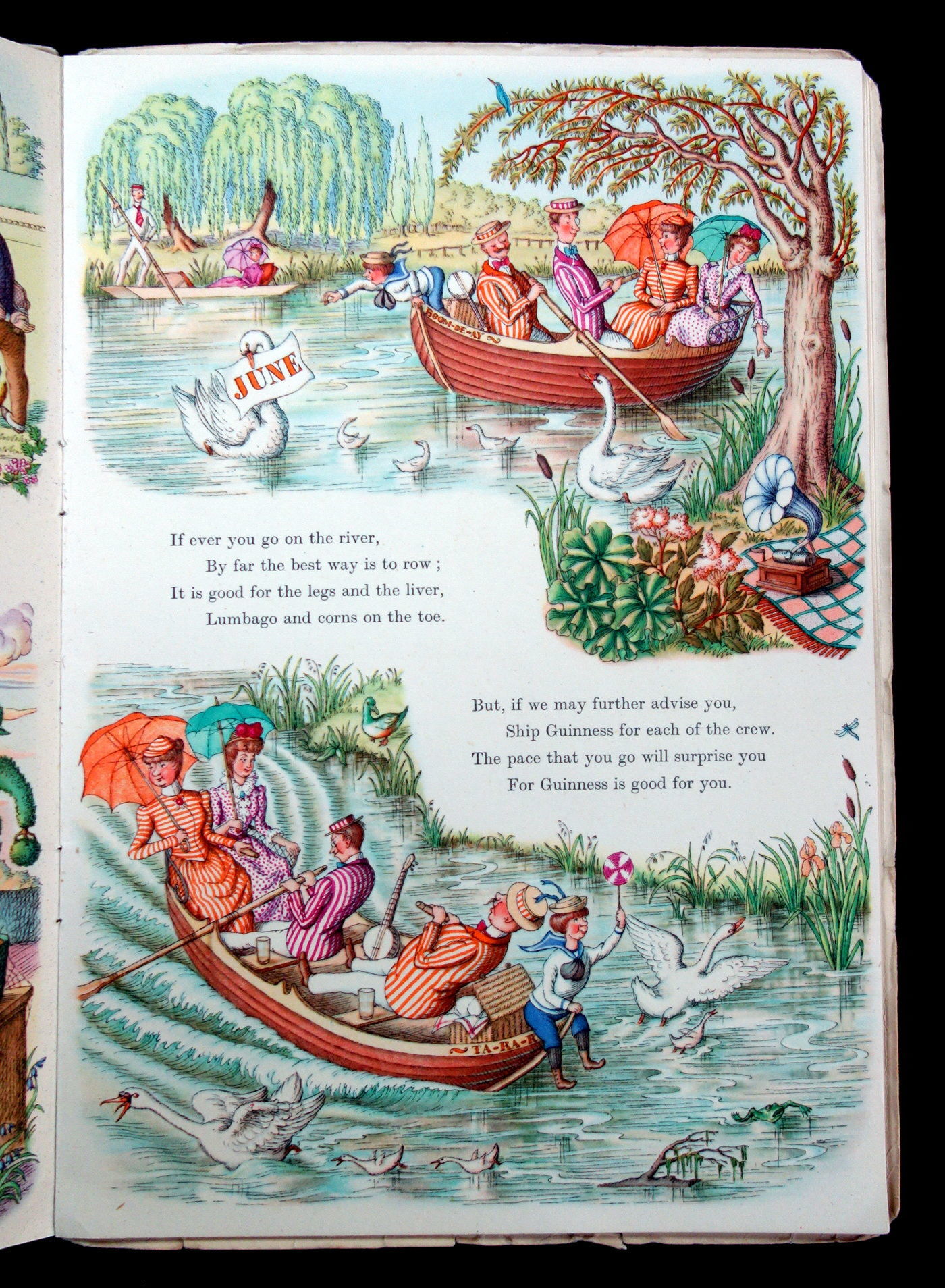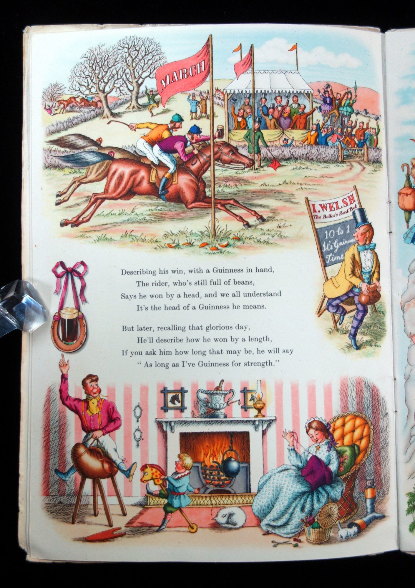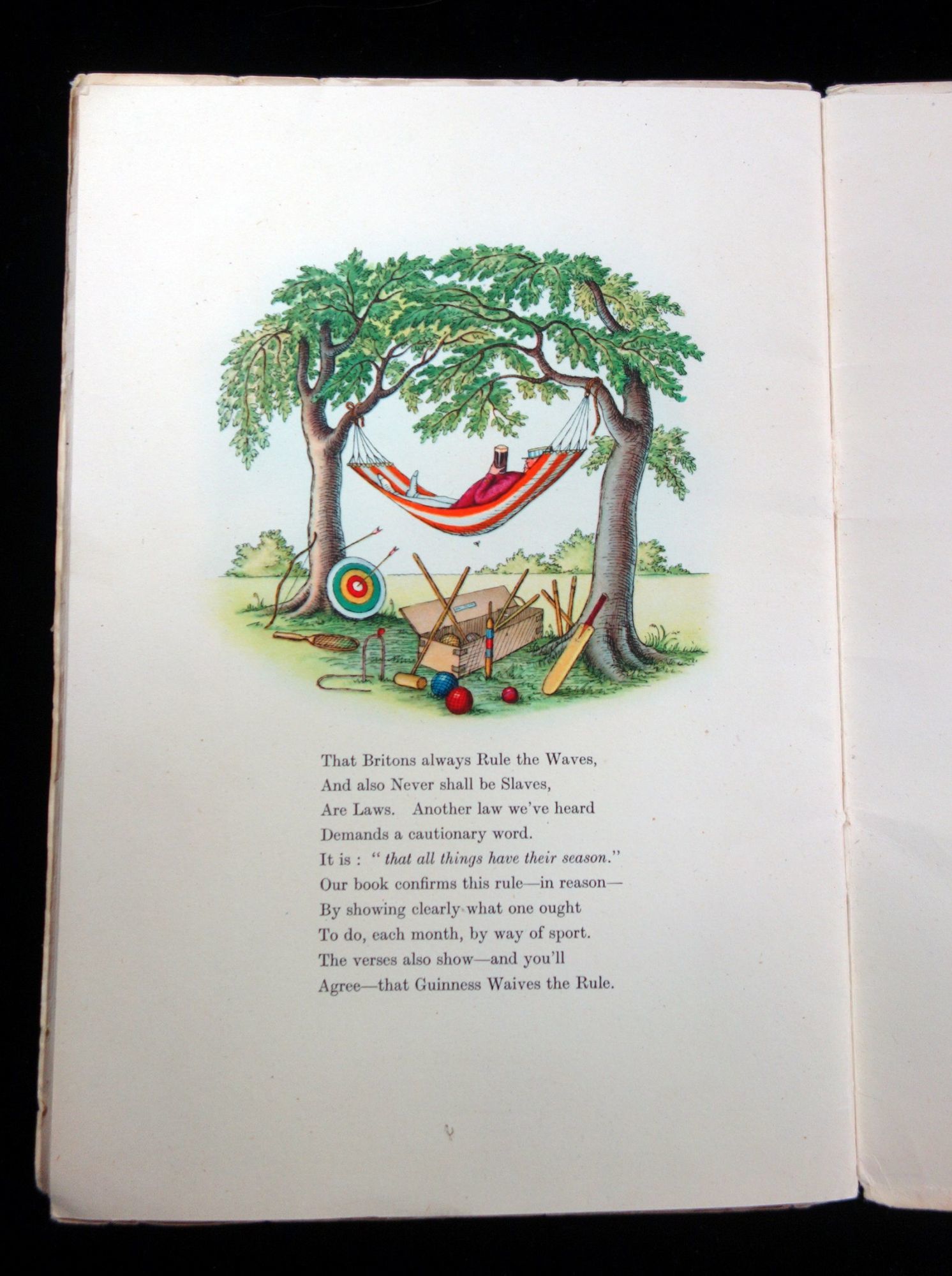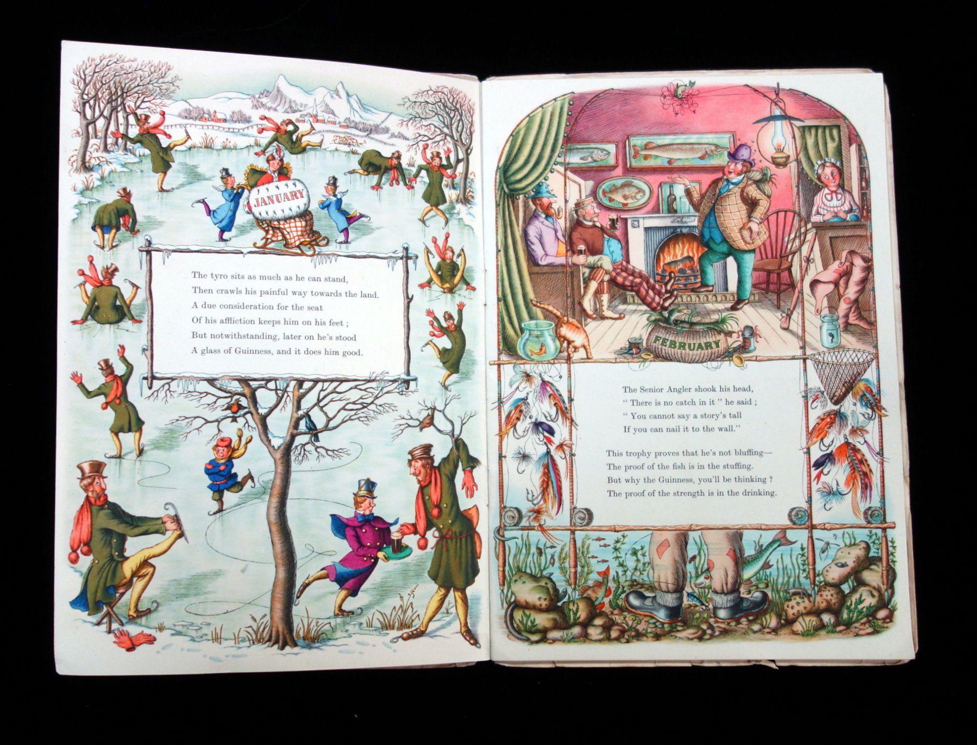 Dublin: Guinness, 1950. Cover edges are frayed. Minor discoloration on back cover.. A humorous and colorful advertising booklet for Guinness Stout. The booklet contains a series of illustrations featuring people doing different sports activities in late Victorian/ Edwardian dress. The activities has been organized by month, so for example, in January the figures are ice skating and in September they are hunting. The illustrations themselves are quite humorous, for example, the illustration of the ice skating shows the same man in the variety of ways he fell down on the pond. In addition to the illustrations each page has a corresponding poem. Below is an example: