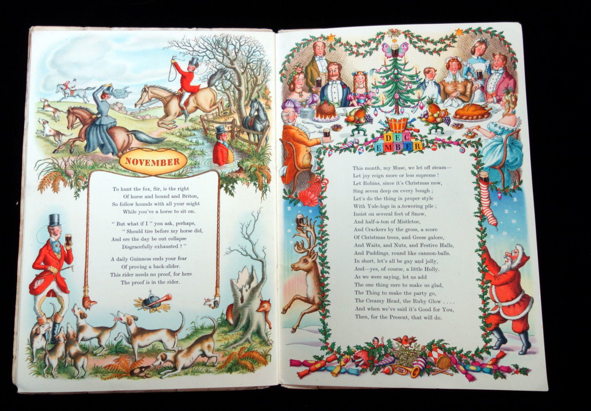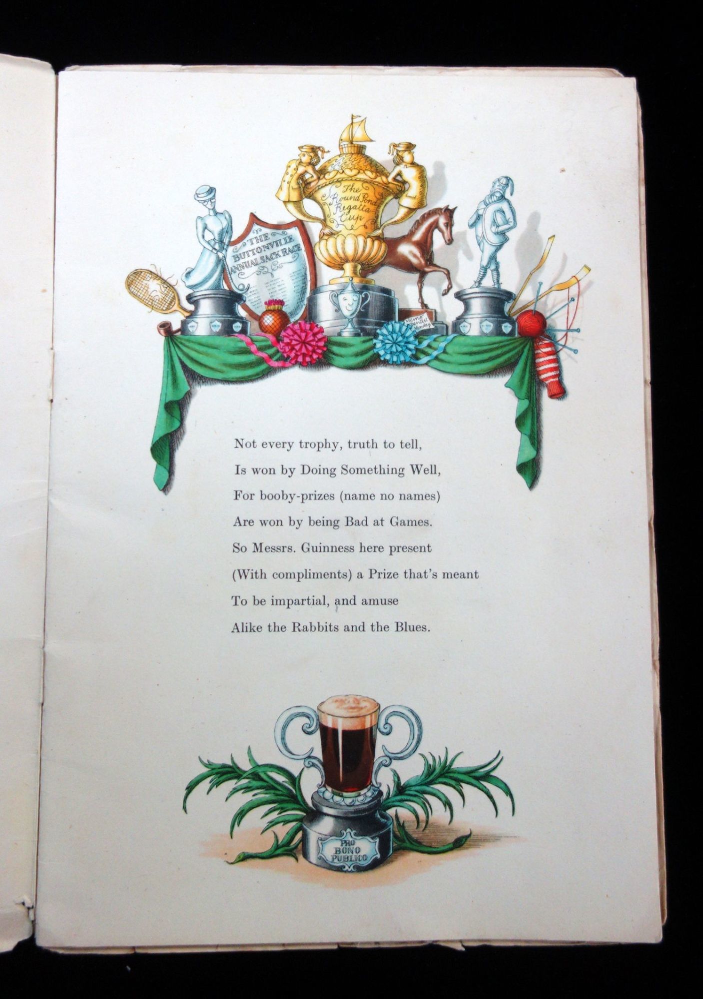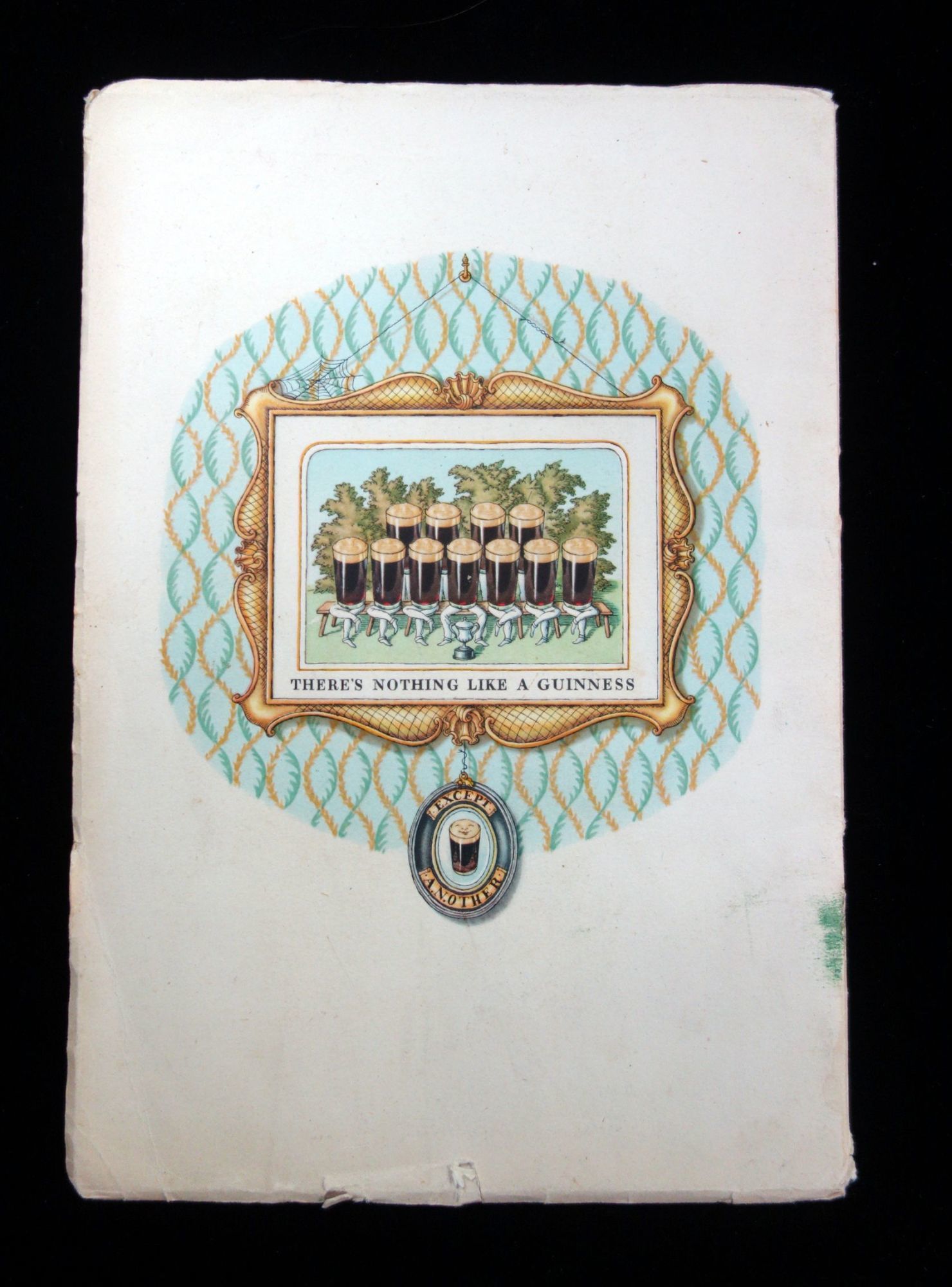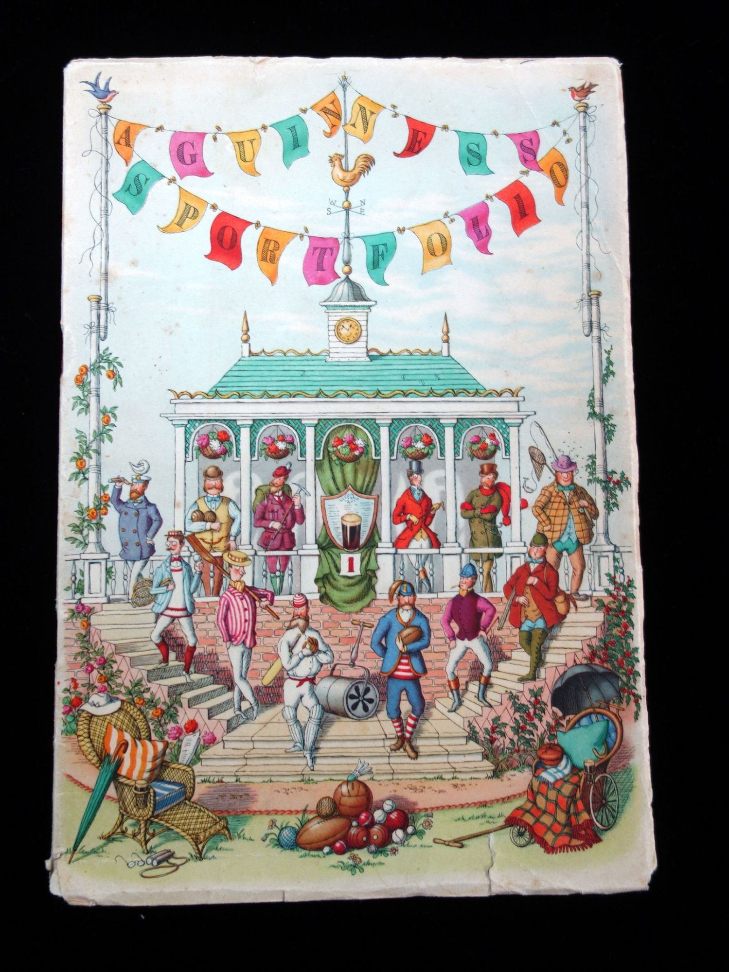 Dublin: Guinness, 1950. Cover edges are frayed. Minor discoloration on back cover.. A humorous and colorful advertising booklet for Guinness Stout. The booklet contains a series of illustrations featuring people doing different sports activities in late Victorian/ Edwardian dress. The activities has been organized by month, so for example, in January the figures are ice skating and in September they are hunting. The illustrations themselves are quite humorous, for example, the illustration of the ice skating shows the same man in the variety of ways he fell down on the pond. In addition to the illustrations each page has a corresponding poem. Below is an example: