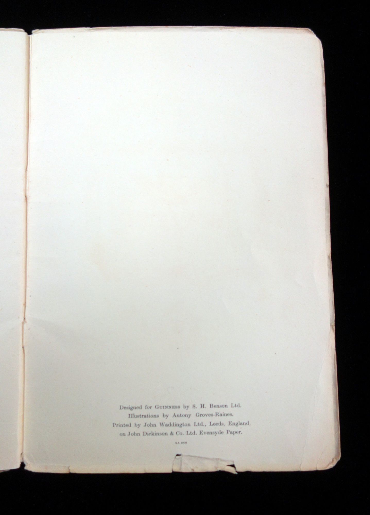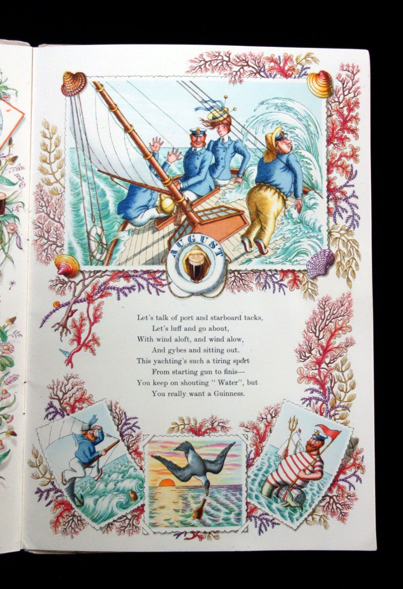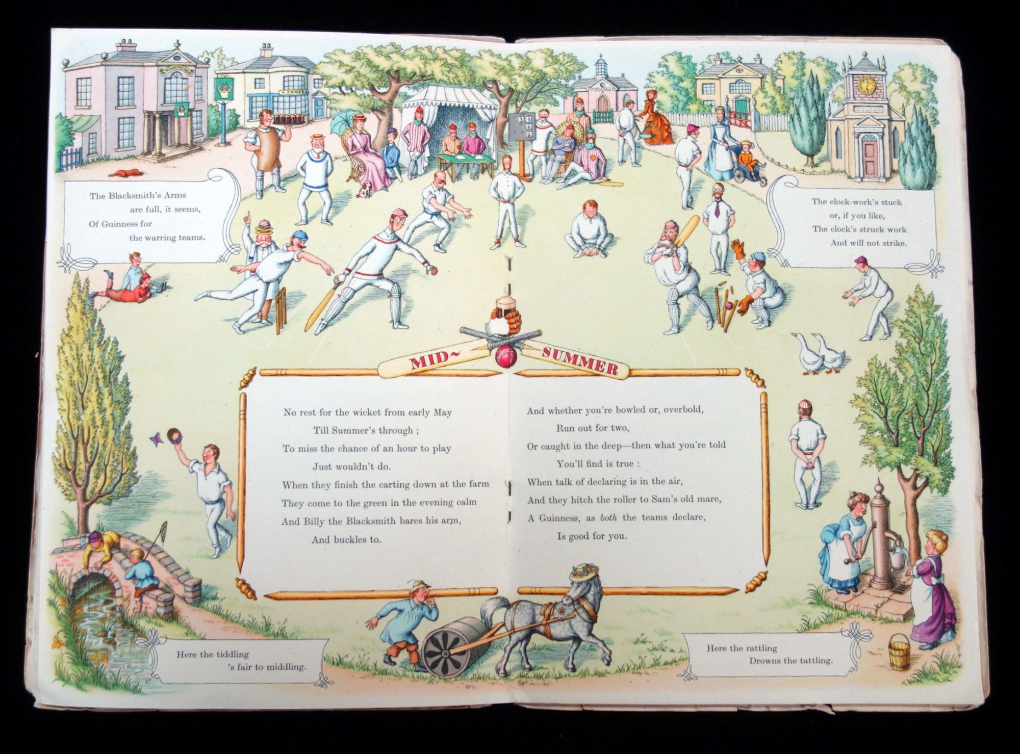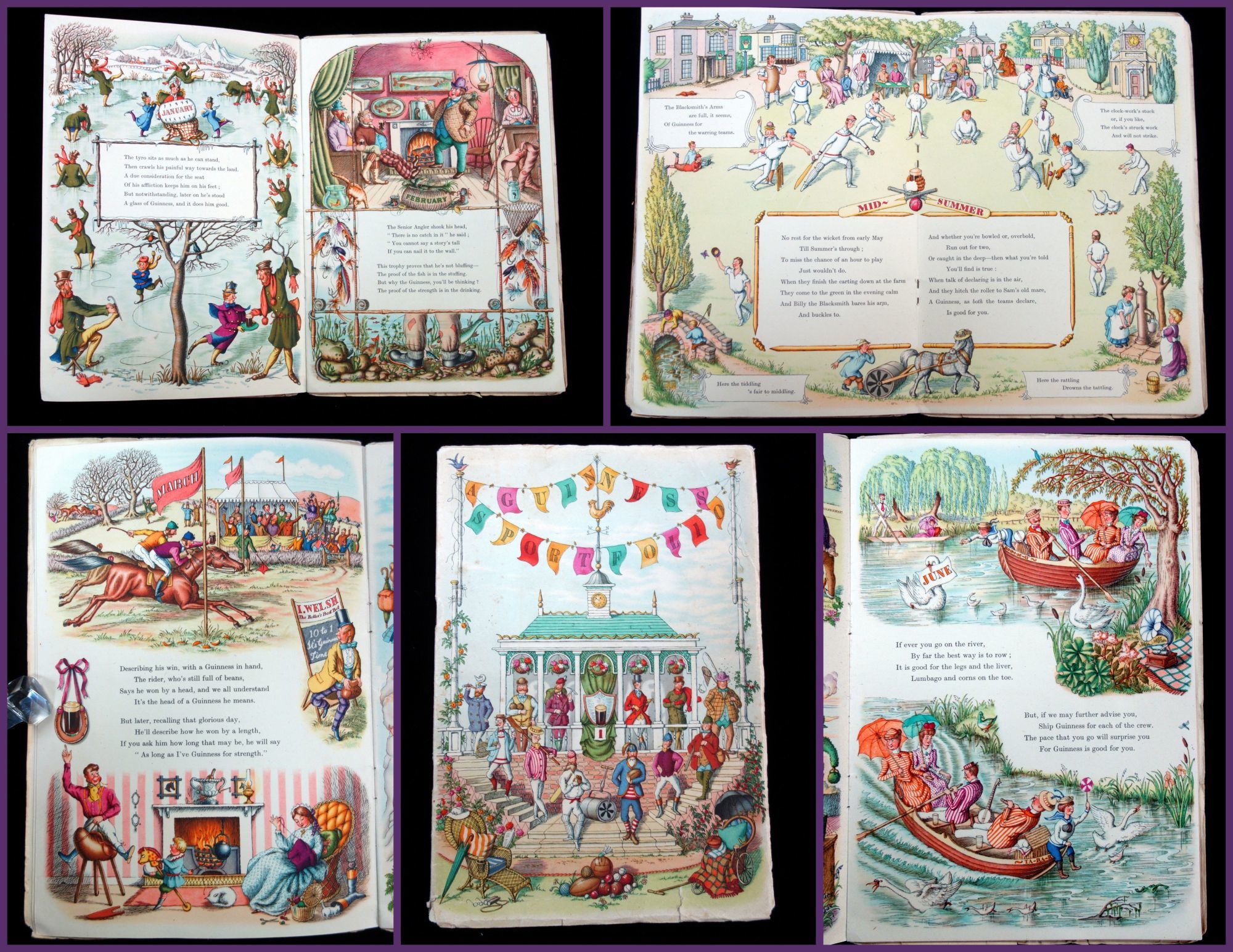 Dublin: Guinness, 1950. Cover edges are frayed. Minor discoloration on back cover.. A humorous and colorful advertising booklet for Guinness Stout. The booklet contains a series of illustrations featuring people doing different sports activities in late Victorian/ Edwardian dress. The activities has been organized by month, so for example, in January the figures are ice skating and in September they are hunting. The illustrations themselves are quite humorous, for example, the illustration of the ice skating shows the same man in the variety of ways he fell down on the pond. In addition to the illustrations each page has a corresponding poem. Below is an example: