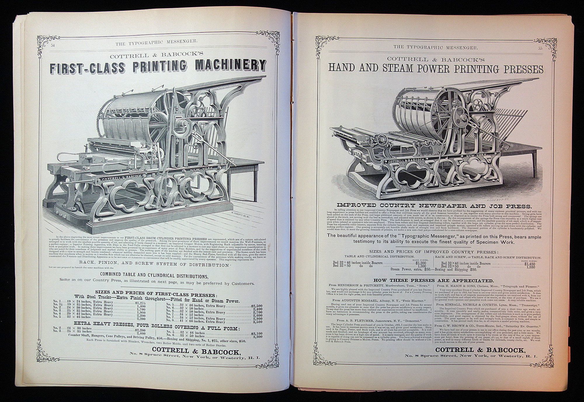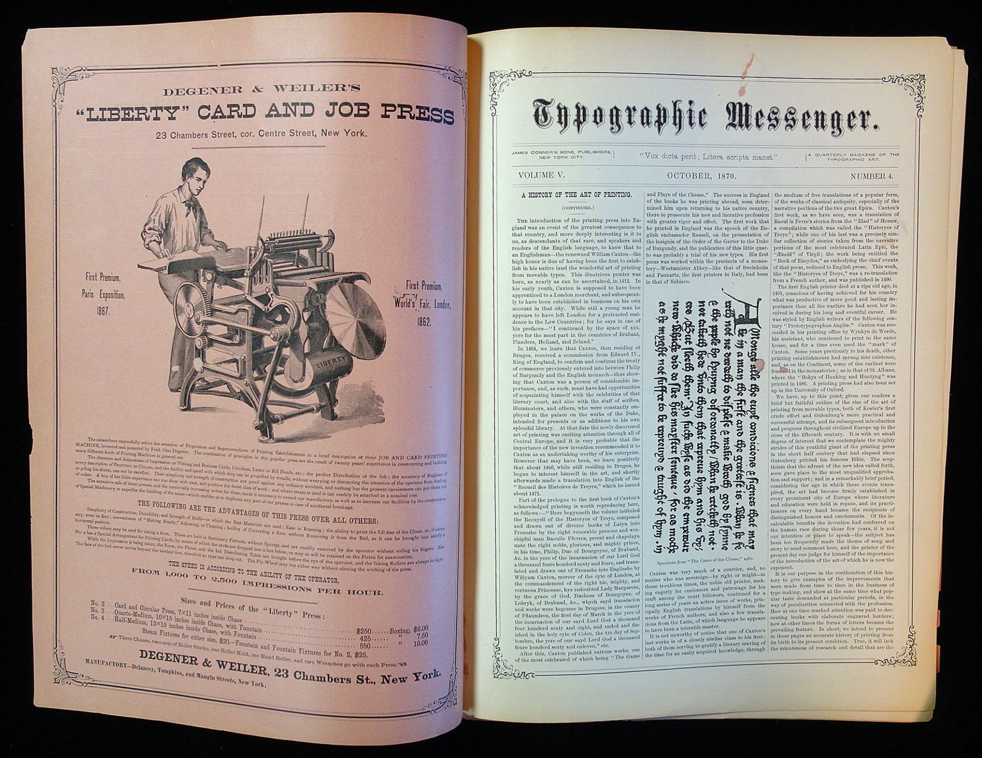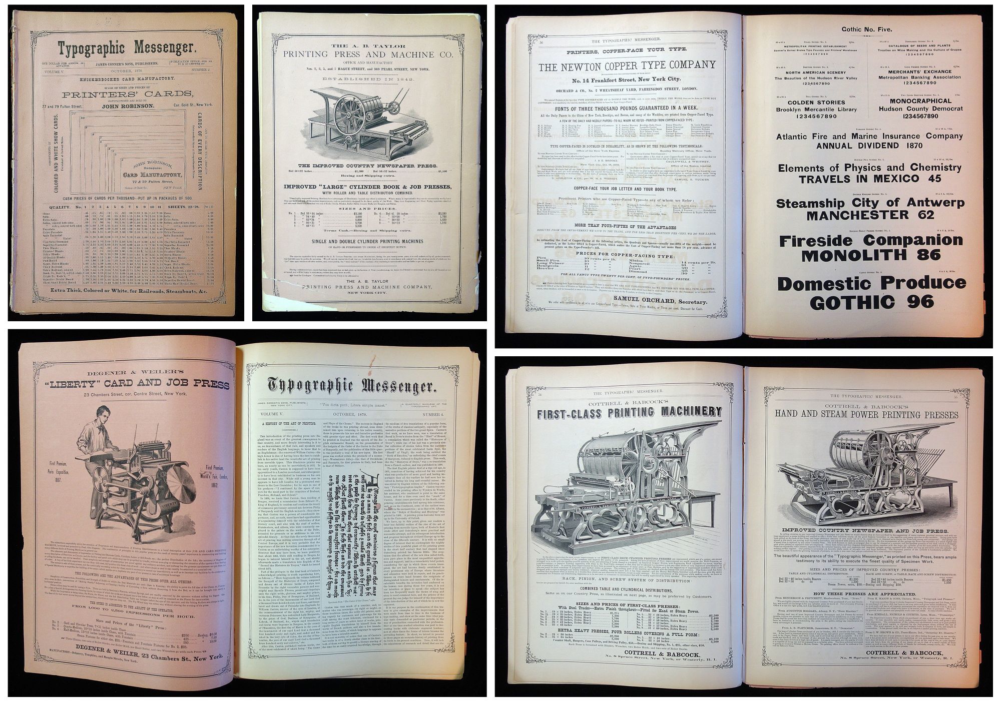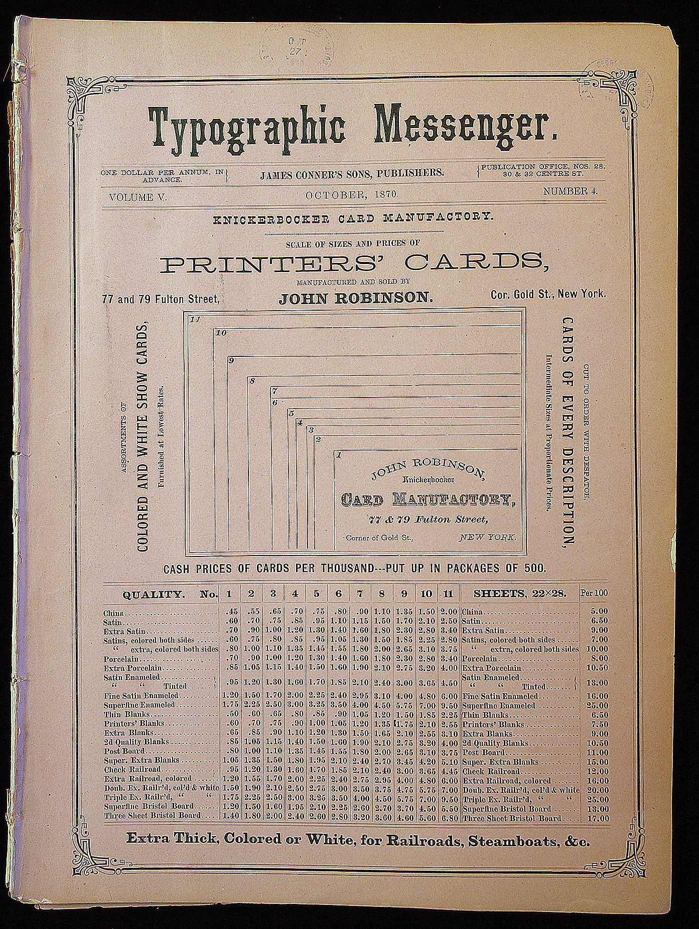 New York: James Conner's Son Publishers, 1870. Front cover has faded stamps on it from it being mailed. Back cover detached but present, and a 6" tear in the middle of the page as well as a 3 1/2" tear along the bottom edge. Damage to back strip due to rubbing. Interior pages toned and soiled due to age. Last interior page has 3 in tear near the binding towards the bottom of the page.. A magazine meant for professional or enthusiasts who were devoted to the typographic arts. This particular volume was printed in October 1870, and is Volume 5, No. 4. The front cover of this issue is an advertisement for Printer's Cards sold by John Robinson from New York. There is a diagram that shows the various cards he has per sale and their cost. Some of the interior pages start with the 'History of the Art of Printing', quarter page to full page illustrated advertisements, generally for printing press, paper cutters and different type faces (Gothic #5, Wood Type, etc) and decorative device border examples. Of note is a full page price list advertisement for The Newton Copper Type Company and Philadelphia Printing Ink Works.