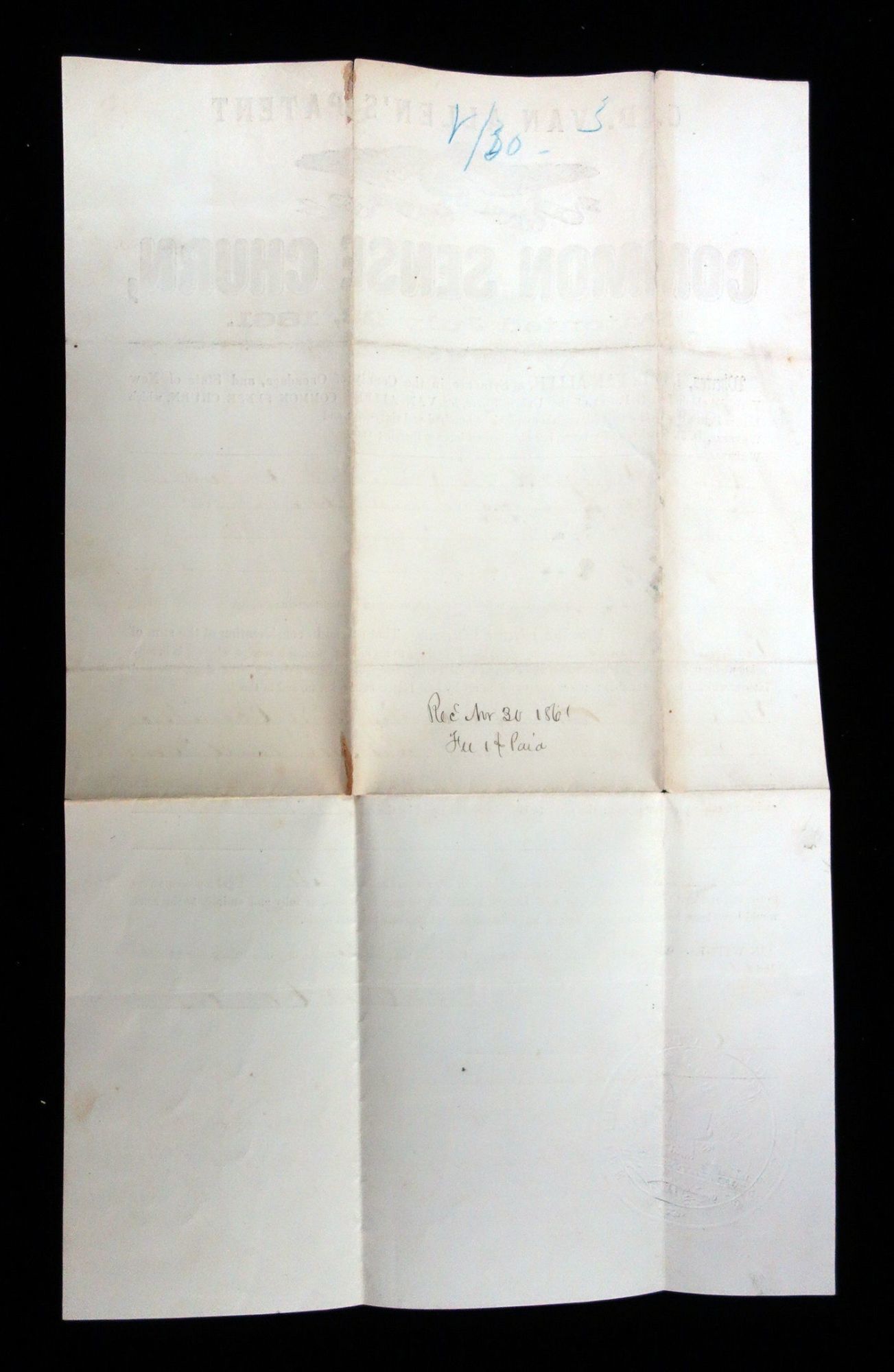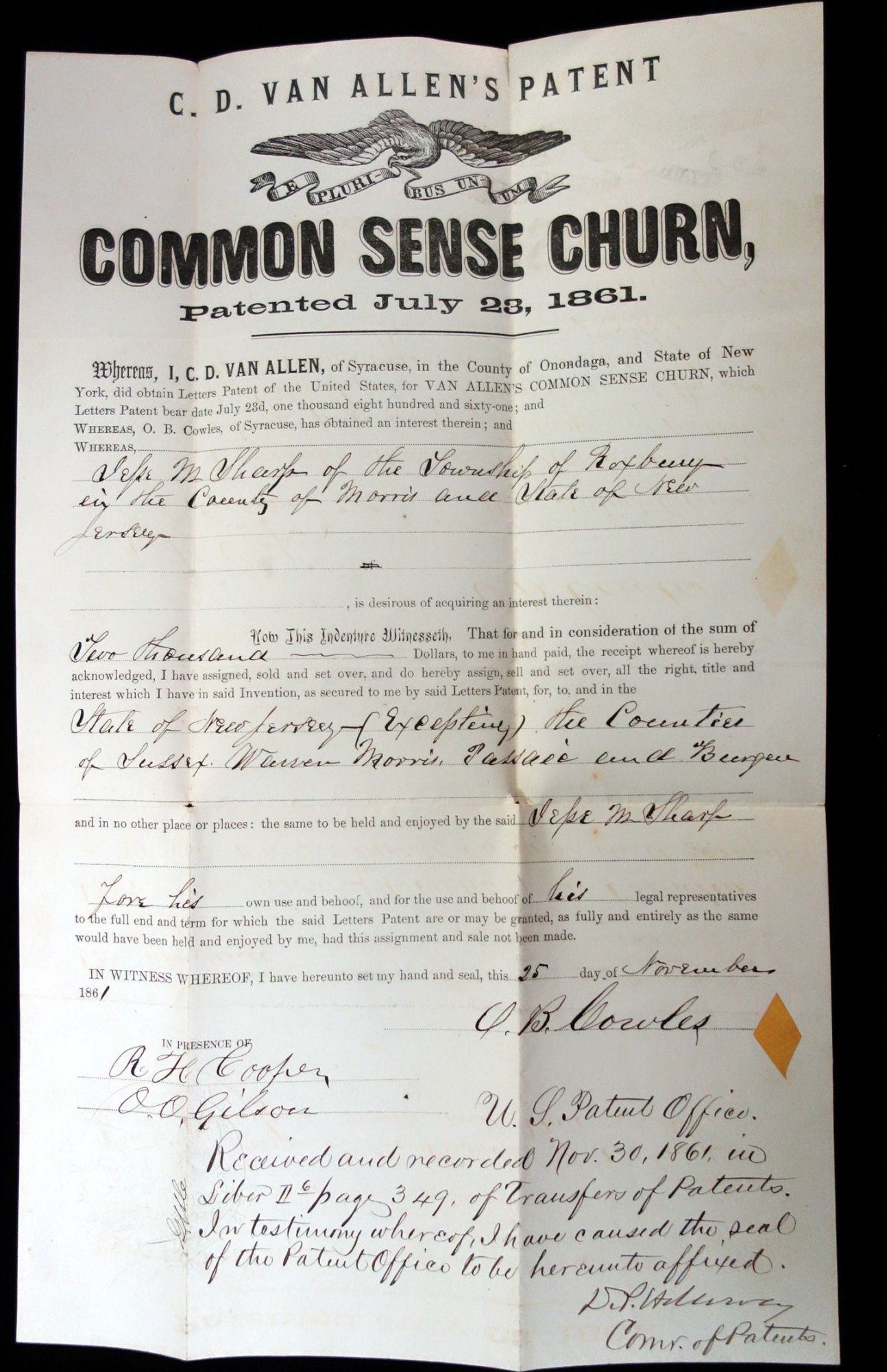 Syracuse, NY, 1861. Minor soiling and toning due to age as well as a few minor separations along the fold.. A transfer of patent certificate for the Common Sense [Butter] Churn. The churn was invented by C. D. Van Allen and patented by him in July 1861 with an O.B. Cowles purchasing shares in it at that time. This certificate is represents when Van Allen transfer his share and ownership of his invention to Jefe M. Sharp of Roxbury, NJ, in November 1861. At the bottom of the certificate it states that the It was received by the US Patent Office on November 30, 1861 and entered into their "Transfer of Patent" files. Reverse is blank. Measures 13 1/2" x 8 1/2